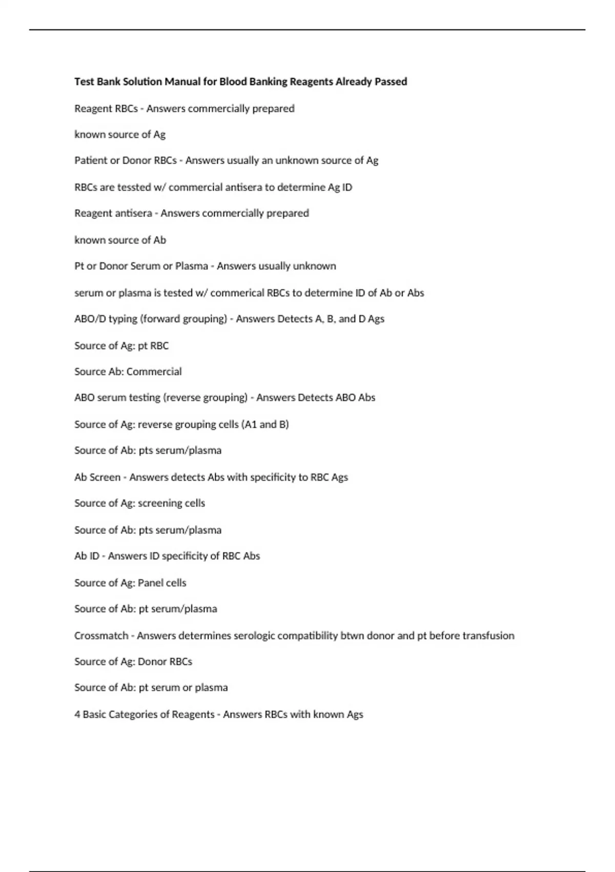 Test Bank Solution Manual for Blood Banking Reagents Already Passed Reagent RBCs - Answers commercially prepared known source of Ag Patient or Donor RBCs - Answers usually an unknown source of Ag RBCs are tessted w/ commercial antisera to determine Ag ID Reagent antisera - Answers commercially prepared known source of Ab Pt or Donor Serum or Plasma - Answers usually unknown serum or plasma is tested w/ commerical RBCs to determine ID of Ab or Abs ABO/D typing (forward grouping) - Answers Detects A, B, and D Ags Source of Ag: pt RBC Source Ab: Commercial ABO serum testing (reverse grouping) - Answers Detects ABO Abs Source of Ag: reverse grouping cells (A1 and B) Source of Ab: pts serum/plasma Ab Screen - Answers detects Abs with specificity to RBC Ags Source of Ag: screening cells Source of Ab: pts serum/plasma Ab ID - Answers ID specificity of RBC Abs Source of Ag: Panel cells Source of Ab: pt serum/plasma Crossmatch - Answers determines serologic compatibility btwn donor and pt before transfusion Source of Ag: Donor RBCs Source of Ab: pt serum or plasma 4 Basic Categories of Reagents - Answers RBCs with known Ags Antisera w/ known Abs Antiglobulin reagents: anti-IgG and or complement Potentiators to enhance Abs Reagent Regulation - Answers FDA's criteria: Reagents must meet minimum standards before being licensed Specificity: recognition of the antigenic determinant and its corresponding Ab Potency: strength of the reaxn Polyclonal Abs - Answers Made from several different clones of B cells that secrete antibodies of different specificities Recognize multiple epitopes Example: antihuman globulin (AHG) Monoclonal antibodies - Answers Made from single clones of B cells that secrete antibodies of the same specificity Use hybridoma- a hybrid cell formed by the fusion of a myeloma cell and an antibody-producing cell; it is used in the production of monoclonal antibodies. technology Recognize a single epitope Examples: anti-A, anti-c, and anti-IgG antibodies ABO Typing - Answers Anti-A and anti-B reagents are used to determine the ABO blood type Both antisera are directed toward specific antigens on the patient's RBCs Anti-A: directed toward A antigen Anti-B: directed toward B antigen ABO Typing (cont'd) - Answers Reagents are formulated to give a strong reaction (3+ to 4+) Testing is performed in the immediate-spin (IS) phase Confirmation testing should check for expected ABO antibodies D Antigen Typing - Answers most important because of increased immunogenicity requires that all blood samples be typed for the D antigen D Antigen Typing Procedure - Answers Commercial anti-D is combined with the patient and donor RBCs. Agglutination indicates the presence of the D antigen; no agglutination indicates the absence of the D antigen. A negative reagent control ensures that a false-positive result has not occurred. High Protein Anti-D Reagents - Answers Contain polyclonal antibodies Approximately 20% bovine albumin Promote false-positive agglutination Low-Protein Reagents - Answers Contain monoclonal antibodies (IgM) or monoclonal and polyclonal blends Approximately 6% bovine albumin Have replaced high-protein reagents A1 and B Cells (cont'd) - Answers Can be from a single donor or a pool of donors Resuspended to a 2% to 5% concentration Negative for Rh antigens (D, C, and E) Should not be used if red cells darken, agglutinate in the vial, or show hemolysis Screening Cells - Answers Screening cells are used in antibody screen (detection) tests for unexpected antibodies Available in sets of 2 or 3 vials