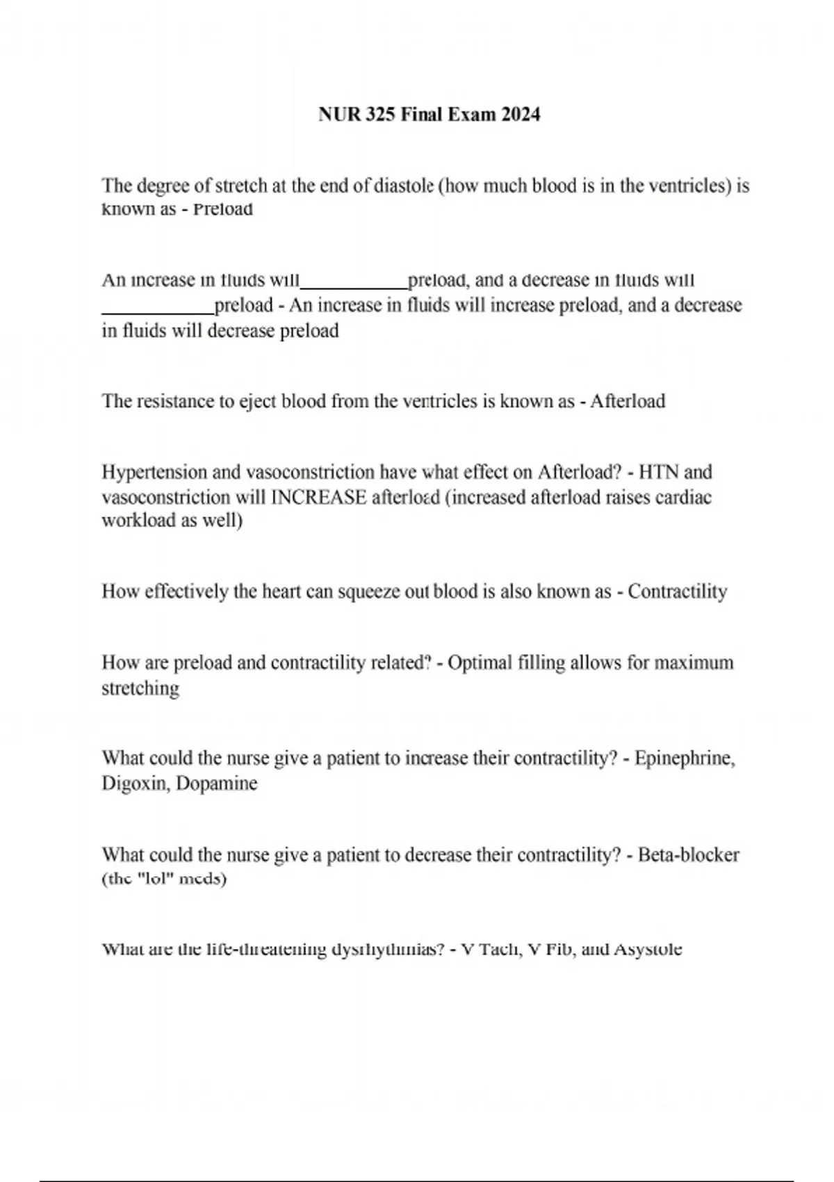 The degree of stretch at the end of diastole (how much blood is in the ventricles) is known as - Preload An increase in fluids will preload, and a decrease in fluids will preload - An increase in fluids will increase preload, and a decrease in fluids will decrease preload The resistance to eject blood from the ventricles is known as - Afterload Hypertension and vasoconstriction have what effect on Afterload? - HTN and vasoconstriction will INCREASE afterload (increased afterload raises cardiac workload as well) How effectively the heart can squeeze out blood is also known as - Contractility How are preload and contractility related? - Optimal filling allows for maximum stretching What could the nurse give a patient to increase their contractility? - Epinephrine, Digoxin, Dopamine What could the nurse give a patient to decrease their contractility? - Beta-blocker (the "lol" meds) What are the life-threatening dysrhythmias? - V Tach, V Fib, and Asystole What is the first thing the nurse should do if they see a life threatening rhythm on a patient's EKG? - Assess the patient (Did a lead fall off? Does the patient show signs of decreased CO? Are they responsive? Pulses?) The patient is in V Tach but has a pulse, how can we treat this? - We give amiodarone and use cardioversion (because they have a pulse) The patient is in V Tach but does NOT have a pulse, how do we treat this? - CPR and Defibrillation The patient is in V Fib, what do we do? - CPR/ACLS, Defibrillate, Drug therapy What drugs can we give to a patient in V Fib? - Epinephrine, Amiodarone I can defibrillate the patient if they have what dysrhythmias? - Pulseless V Tach, and V Fib The patient is a candidate for Synchronized Cardioversion if they have what dysrhythmias? - V Tach (WITH A PULSE), SVT, A Fib, and A Flutter The patient is asystolic, what do you do? - CPR/ACLS, drug therapy, intubate What drugs do we give if the patient is in asystole? - Epinephrine and/or vasopressin The patient shows activity on their EKG but has no pulse, this is known as - Pulseless Electrical Activity (PEA) The patient has a normal heart rate, but the PR interval is longer than normal. What dysrhythmia do you suspect the patient has? - 1st Degree AV Block You notice a gradual lengthening in the patient's PR intervals and a missing QRS wave. What dysrhythmia do you suspect the patient has? - 2nd Degree AV Block Type 1 (Mobitz I // Wenckebach) The patient has constant elongated PR intervals and P waves at a regular rate, but missing QRS complexes. What dysrhythmia do you suspect? - 2nd Degree AV Block Type 2 (Mobitz II) You notice the patient has consistent P waves and QRS complexes, but the rates between the two are different (Some P waves do not have a QRS after). What dysrhythmia do you suspect? - 3rd Degree AV Heart Block (Complete Heart Block) The main cause of CAD, characterized by fat deposits in the arteries - Atherosclerosis What are some modifiable risk factors for CAD? - Lipid levels, HTN, smoking, obesity, inactivity This cholesterol transports lipids to the liver for removal, known as the "good cholesterol" - High Density Lipoprotein (HDL) This cholesterol transports lipids to the arterial vessels, known as the "bad cholesterol" - Low Density Lipoprotein (LDL) A serum cholesterol of indicates a risk factor for CAD - >200 A total triglyceride level of indicates a risk factor for CAD - >150 What drugs can we give to lower lipid levels and manage CAD? - Statins: Decrease cholesterol and LDL's, increase HDL's Niacin: Lowers LDL's and Triglycerides, increases HDL's The physician places an order for cardiac enzymes to be drawn. The nurse knows this order will consist of what lab values? - Myoglobin, BNP, CK-MB, Troponin I, and Troponin T The normal range for Troponin I is ? The normal range for Troponin T is ? - Troponin I: < 0.03 Troponin T: < 0.1 Inadequate cardiac pumping/filling leading to insufficient blood & oxygen supply to tissues - Heart Failure (HF) The nurse knows that the backflow of blood from the left atrium to the pulmonary veins is the cause of ? - Left-Sided HF What symptoms might you expect in a patient with Left-Sided HF? - Paroxysmal Nocturnal Dyspnea, restlessness, fatigue, orthopnea Pulmonary Congestion (Cough, crackles, wheezing, blood-tinged sputum, and tachypnea) The nurse knows that backflow of blood into the right atrium and venous circulation is the cause of ? - Right-Sided HF Right-Sided HF is most commonly caused by what? - Left-Sided HF What symptoms might the nurse expect in a patient with Right-Sided HF? - Dependent Edema, Ascites, Splenomegaly, Hepatomegaly, JVD, GI distress The normal ejection fraction ranges from? - 55-65% This lab value indicates ventricular wall stretching: - BNP The normal range for BNP is: Increased risk for mortality is associated with what BNP level? - Normal: < 100 Risk for mortality: > 500 The nurse expects to give which diuretics to the patient with HF? - Furosemide The nurse expects to give which medications when caring for a patient with HF (not including diuretics)? - Lisinopril, Metoprolol, Digoxin, Nitroglycerin What is a key nursing intervention for patients with HF? - Fluid and sodium restriction (Usually 2L/day and 2g/day) What amount of HF weight gain in 2 days should be reported? What amount of HF weight gain in a week should be reported - 3 pounds over 2 days 3-5 pounds in a week What are the normal ABG values? - pH: 7.35-7.45 PaCO2: 35-45 HCO3: 22-26 How does a decreased PaCO2 affect pH levels? - A decreased PaCO2 will increase pH (Respiratory Alkalosis) How does an increased PaCO2 affect pH? - An increased PaCO2 will decrease pH (Respiratory Acidosis) How does an increase in HCO3 affect the pH? - An increased HCO3 will increase the pH (Metabolic Alkalosis) How does a decreased HCO3 affect pH? - A decreased HCO3 will result in a decreased pH level (Metabolic Acidosis) Your patient's airway is obstructed resulting in hypoventilation, how might this affect their ABG's? - Hy