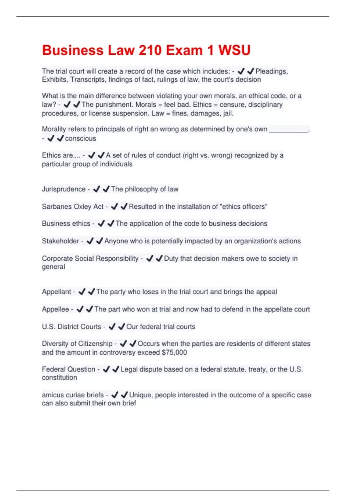 The trial court will create a record of the case which includes: - ️️Pleadings, Exhibits, Transcripts, findings of fact, rulings of law, the court's decision What is the main difference between violating your own morals, an ethical code, or a law? - ️️The punishment. Morals = feel bad. Ethics = censure, disciplinary procedures, or license suspension. Law = fines, damages, jail. Morality refers to principals of right an wrong as determined by one's own __________. - ️️conscious Ethics are.... - ️️A set of rules of conduct (right vs. wrong) recognized by a particular group of individuals Jurisprudence - ️️The philosophy of law Sarbanes Oxley Act - ️️Resulted in the installation of "ethics officers" Business ethics - ️️The application of the code to business decisions Stakeholder - ️️Anyone who is potentially impacted by an organization's actions Corporate Social Responsibility - ️️Duty that decision makers owe to society in general Appellant - ️️The party who loses in the trial court and brings the appeal Appellee - ️️The part who won at trial and now had to defend in the appellate court U.S. District Courts - ️️Our federal trial courts Diversity of Citizenship - ️️Occurs when the parties are residents of different states and the amount in controversy exceed $75,000 Federal Question - ️️Legal dispute based on a federal statute. treaty, or the U.S. constitution amicus curiae briefs - ️️Unique, people interested in the outcome of a specific case can also submit their own briefForum state - ️️The state in which the court is located Concurrent jurisdiction - ️️The plaintiff may file suit in either court Forum Non Conveniens - ️️Asks the court to move the case to a more convenient courthouse even though the original court has jurisdiction Arbitration - ️️Legal process where a neutral third party called the arbitrator hears the dispute and makes a decision Civil Lawsuit - ️️When someone is injured, they may seek damages from the party who injured them by filing a lawsuit A cause of action - ️️The legal claim needed in order to recover damages Complaint - ️️Set forth the cause of action and remedy that the plaintiff is pursuing Summons - ️️sets forth the time within which the defendant has to reply Motion to Dismiss - ️️Used to convince the court that even if everything that the plaintiff said in the Complaint was true, it must be dismissed because the jurisdiction does not recognize that type of lawsuit either because it contains no valid claim or it is defective in some way Affirmative defense - ️️Legal position which would defeat the claim such as truth in the case of defamation Counterclaim - ️️Claim for relief by the defendant against the plaintiff under his own theory of recovery arising out of the same set of facts Default judgement - ️️If the defendant fails to file an answer, the court will grant judgement for the plaintiff Discovery - ️️The way in which the parties can obtain information in the other party's possession Deposition - ️️Oral testimony of a witness or a party recorded by a court reporter to be preserved for trial Interrogatories - ️️Written questions submitted by one party to another. Summary Judgement Motion - ️️Filed if one or both of the attorneys believes there are no genuine issues of material factVoir Dire - ️️Process of choosing a jury Direct Examination - ️️When an attorney question his or her witness Cross Examination - ️️When the opposing party questions the same witness