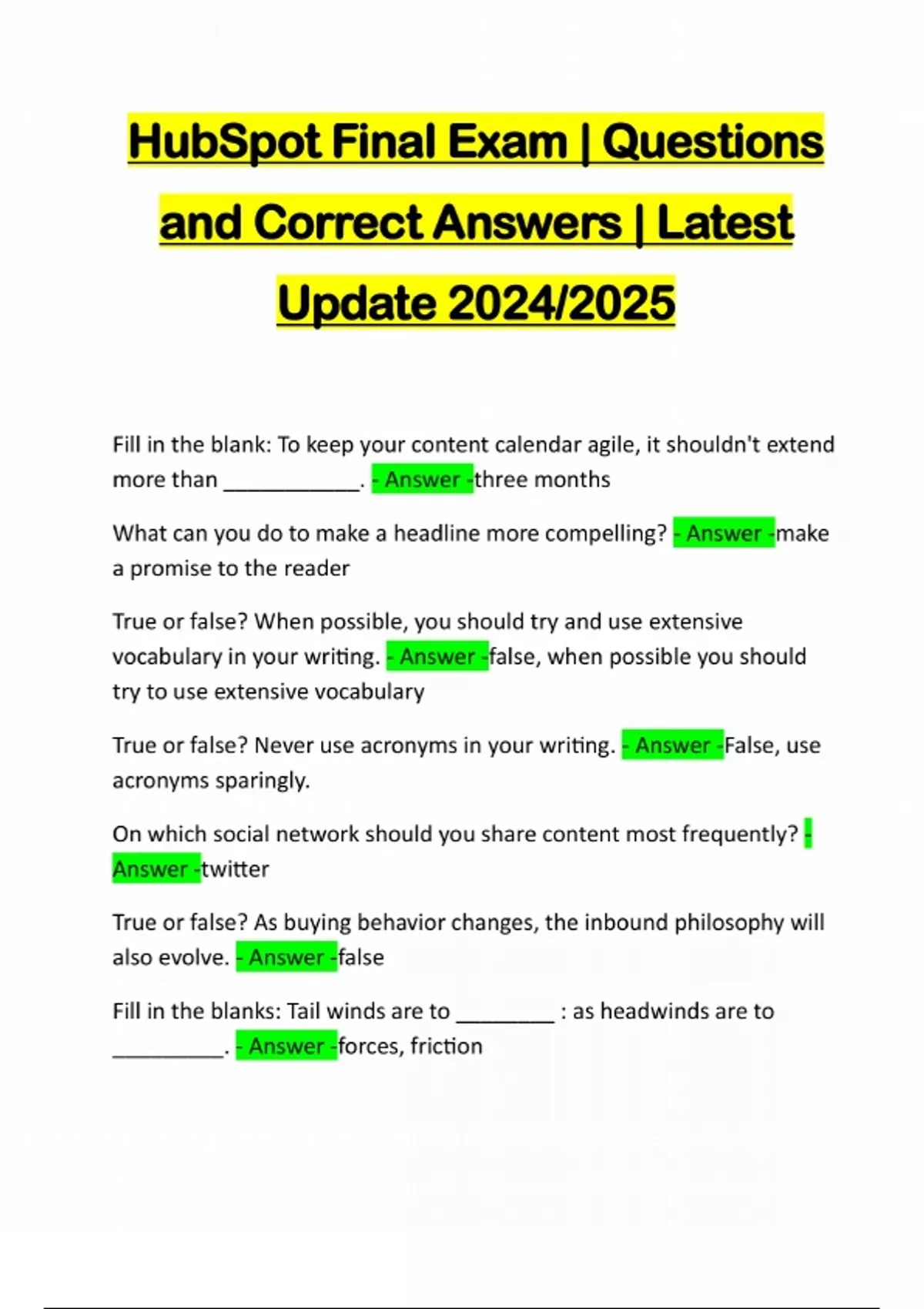HubSpot Final Exam | Questions and Correct Answers | Latest Update 2024/2025 Fill in the blank: To keep your content calendar agile, it shouldn't extend more than ___________. - Answer -three months What can you do to make a headline more compelling? - Answer -make a promise to the reader True or false? When possible, you should try and use extensive vocabulary in your writing. - Answer -false, when possible you should try to use extensive vocabulary True or false? Never use acronyms in your writing. - Answer -False, use acronyms sparingly. On which social network should you share content most frequently? - Answer -twitter
