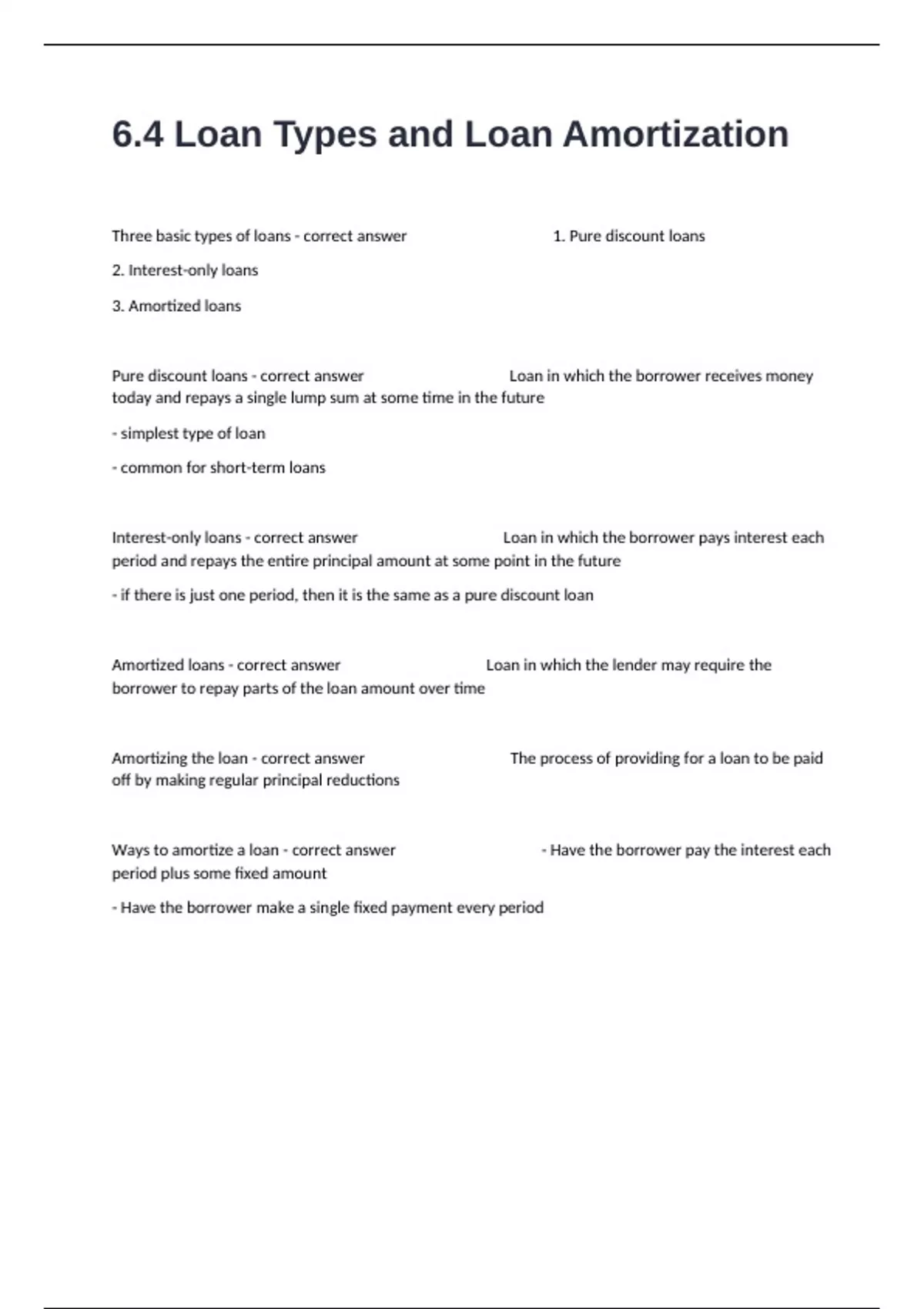 Pure discount loans - correct answer Loan in which the borrower receives money