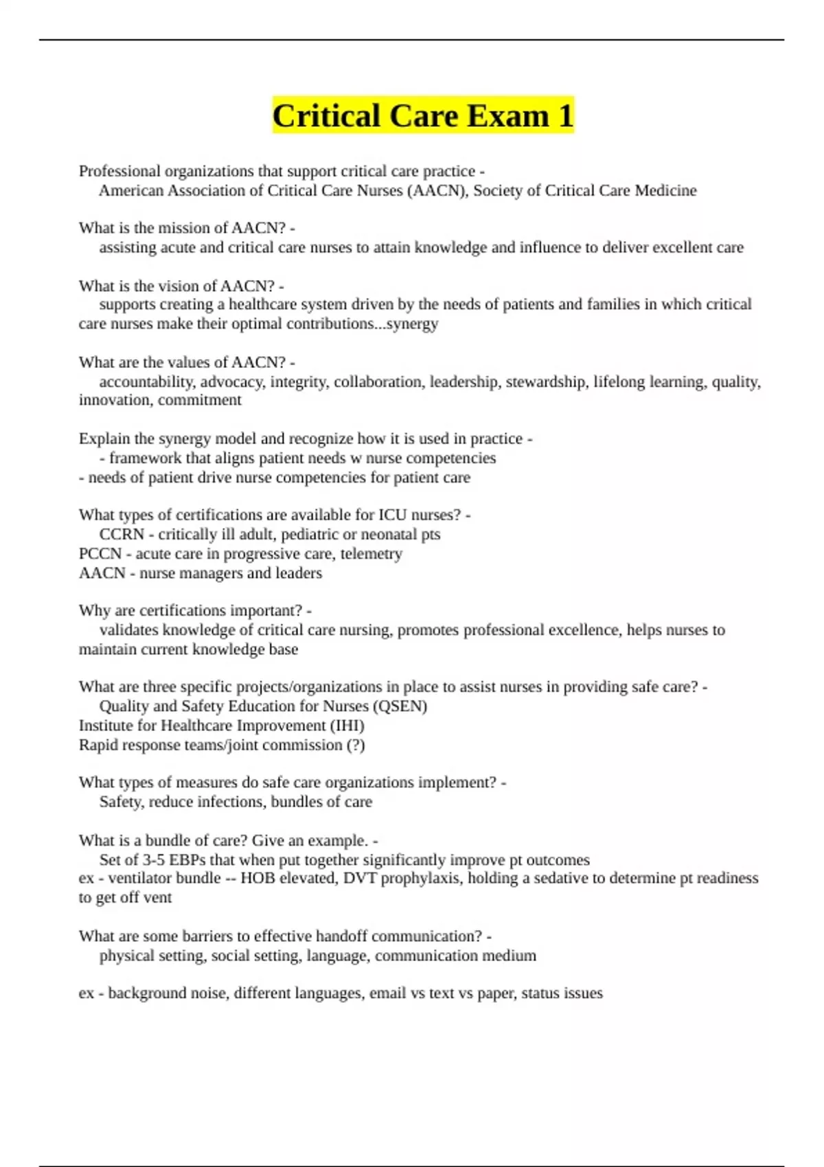 Professional organizations that support critical care practice - American Association of Critical Care Nurses (AACN), Society of Critical Care Medicine What is the mission of AACN? - assisting acute and critical care nurses to attain knowledge and influence to deliver excellent care What is the vision of AACN? - supports creating a healthcare system driven by the needs of patients and families in which critical care nurses make their optimal contributions...synergy What are the values of AACN? - accountability, advocacy, integrity, collaboration, leadership, stewardship, lifelong learning, quality, innovation, commitment Explain the synergy model and recognize how it is used in practice - - framework that aligns patient needs w nurse competencies - needs of patient drive nurse competencies for patient care What types of certifications are available for ICU nurses? - CCRN - critically ill adult, pediatric or neonatal pts PCCN - acute care in progressive care, telemetry AACN - nurse managers and leaders