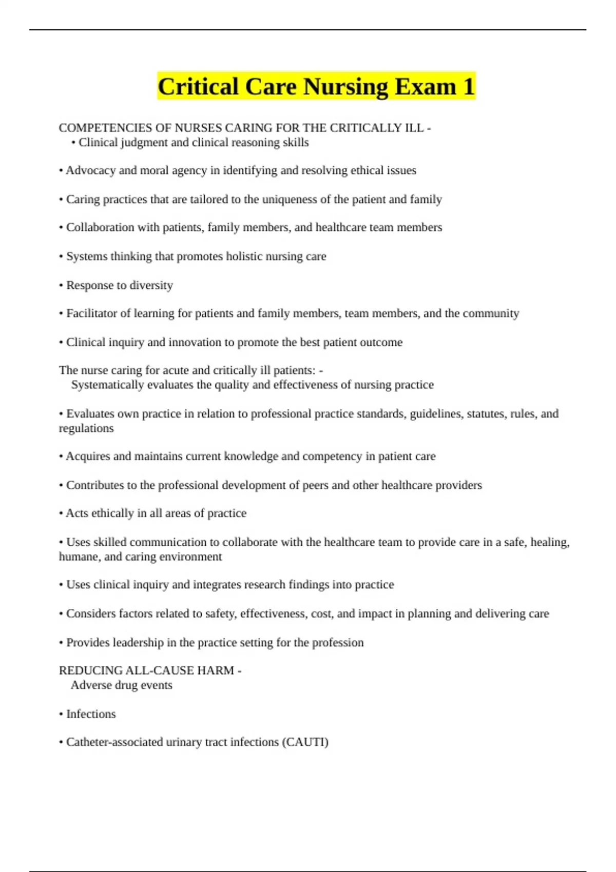 COMPETENCIES OF NURSES CARING FOR THE CRITICALLY ILL - • Clinical judgment and clinical reasoning skills • Advocacy and moral agency in identifying and resolving ethical issues • Caring practices that are tailored to the uniqueness of the patient and family • Collaboration with patients, family members, and healthcare team members • Systems thinking that promotes holistic nursing care • Response to diversity • Facilitator of learning for patients and family members, team members, and the community • Clinical inquiry and innovation to promote the best patient outcome The nurse caring for acute and critically ill patients: - Systematically evaluates the quality and effectiveness of nursing practice • Evaluates own practice in relation to professional practice standards, guidelines, statutes, rules, and regulations • Acquires and maintains current knowledge and competency in patient care • Contributes to the professional development of peers and other healthcare providers • Acts ethically in all areas of practice