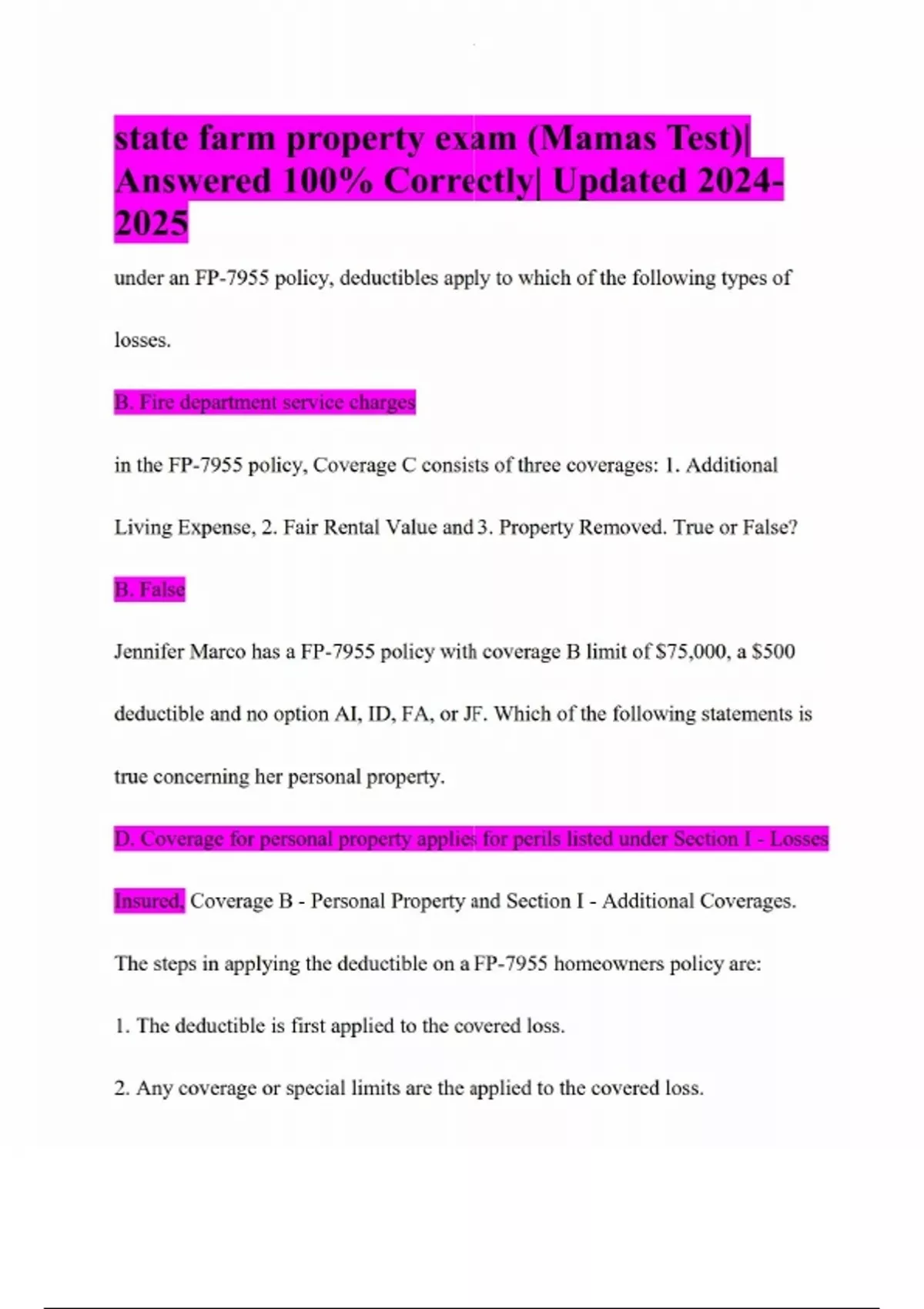 state farm property exam (Mamas Test)| Answered 100% Correctly| Updated under an FP-7955 policy, deductibles apply to which of the following types of losses. B. Fire department service charges in the FP-7955 policy, Coverage C consists of three coverages: 1. Additional Living Expense, 2. Fair Rental Value and 3. Property Removed. True or False? B. False Jennifer Marco has a FP-7955 policy with coverage B limit of $75,000, a $500 deductible and no option AI, ID, FA, or JF. Which of the following statements is true concerning her personal property. D. Coverage for personal property applies for perils listed under Section I - Losses Insured, Coverage B - Personal Property and Section I - Additional Coverages. The steps in applying the deductible on a FP-7955 homeowners policy are: 1. The deductible is first applied to the covered loss. 2. Any coverage or special limits are the applied to the covered loss. 3. The amount payable to the insured will be the greater of the amounts arrived at in steps 1 and 2. True or False? A. True The definition of an insured includes all of the following except: B. Spouse Composition shingles can be purchased in bundles which could be 1/3 square or 1/4 square. True or False? A. True The formula for determining the area of a trapezoid is: