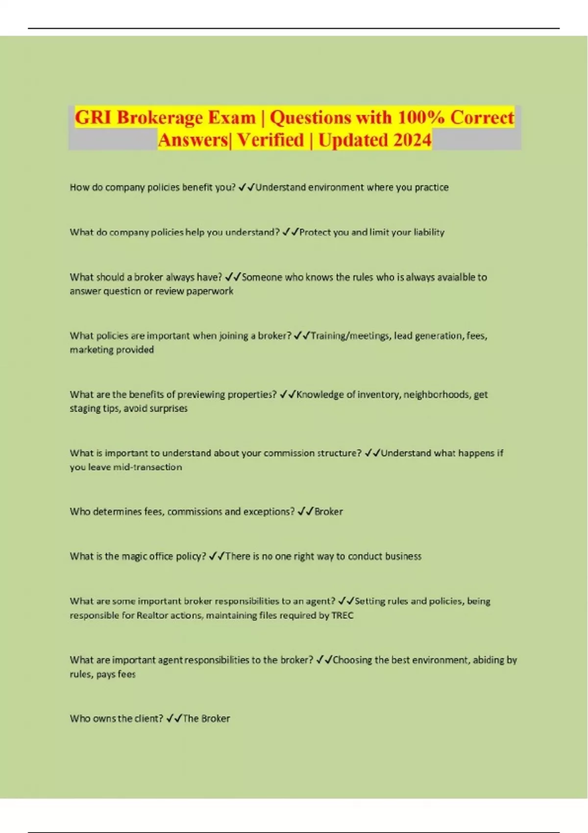 GRI Brokerage Exam | Questions with 100% Correct Answers| Verified | Updated 2024