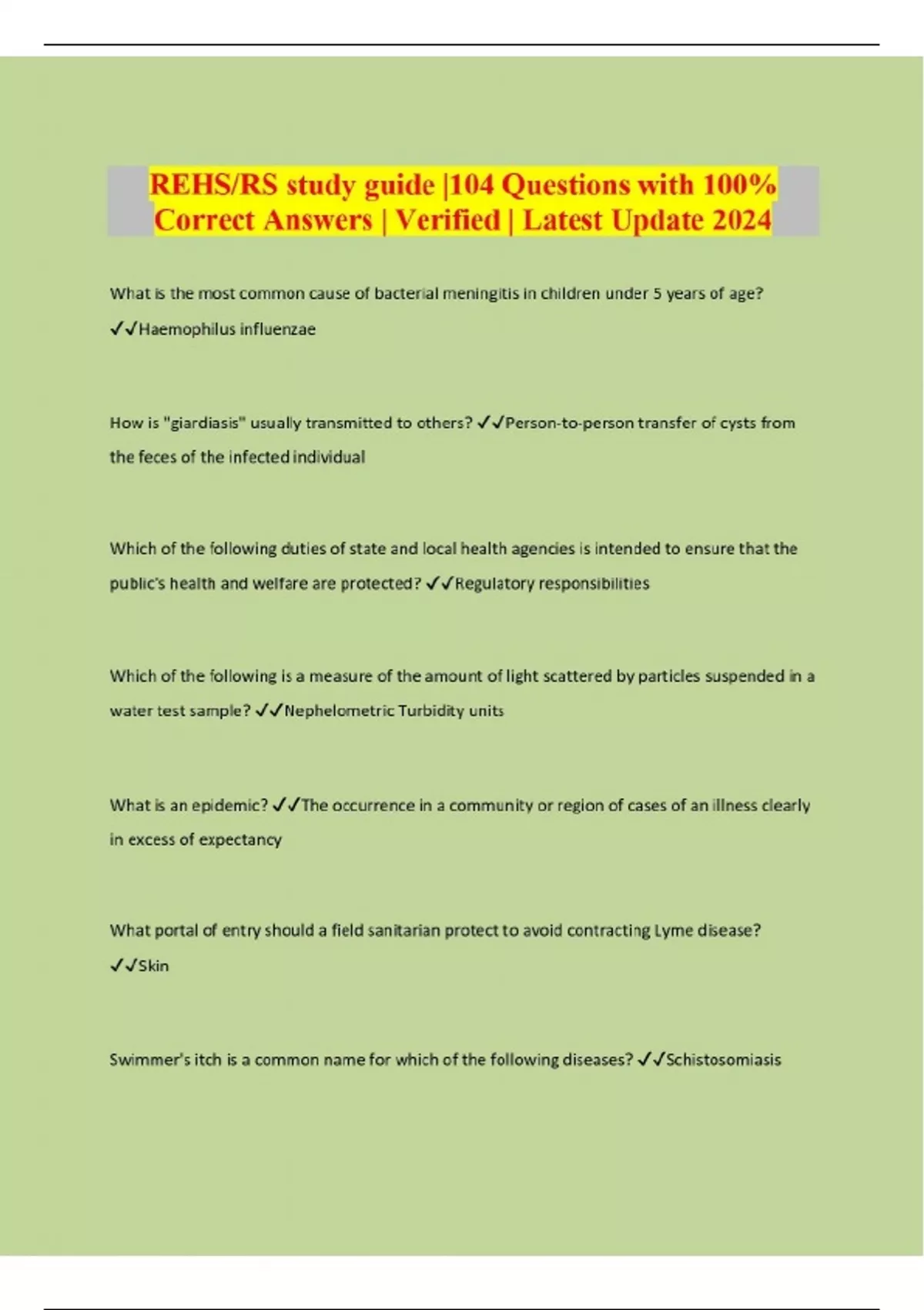 REHS/RS study guide |104 Questions with 100% Correct Answers | Verified | Latest Update 2024