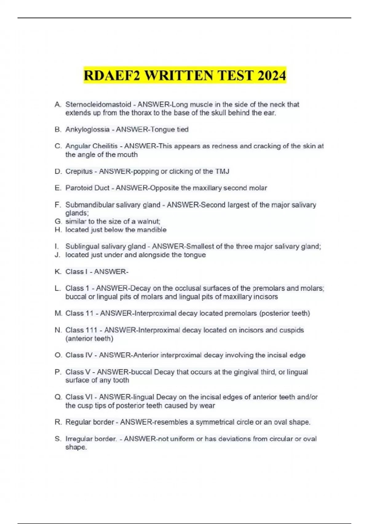 RDAEF2 WRITTEN TEST 2024 A. Sternocleidomastoid - ANSWER-Long muscle in the side of the neck that extends up from the thorax to the base of the skull behind the ear. B. Ankyloglossia - ANSWER-Tongue tied C. Angular Cheilitis - ANSWER-This appears as redness and cracking of the skin at the angle of the mouth D. Crepitus - ANSWER-popping or clicking of the TMJ E. Parotoid Duct - ANSWER-Opposite the maxillary second molar F. Submandibular salivary gland - ANSWER-Second largest of the major salivary glands; G. similar to the size of a walnut; H. located just below the mandible I. Sublingual salivary gland - ANSWER-Smallest of the three major salivary gland; J. located just under and alongside the tongue K. Class I - ANSWER- L. Class 1 - ANSWER-Decay on the occlusal surfaces of the premolars and molars; buccal or lingual pits of molars and lingual pits of maxillary incisors M. Class 11 - ANSWER-Interproximal decay located premolars (posterior teeth) N. Class 111 - ANSWER-Interproximal decay located on incisors and cuspids (anterior teeth) O. Class IV - ANSWER-Anterior interproximal decay involving the incisal edge P. Class V - ANSWER-buccal Decay that occurs at the gingival third, or lingual surface of any tooth Q. Class VI - ANSWER-lingual Decay on the incisal edges of anterior teeth and/or the cusp tips of posterior teeth caused by wear R. Regular border - ANSWER-resembles a symmetrical circle or an oval shape. S. Irregular border. - ANSWER-not uniform or has deviations from circular or oval shape. T. Smooth margin. - ANSWER-level with the surface of the lesion. U. Raised margin - ANSWER-above the level of the surface of the lesion. V. Papule. - ANSWER-a solid raised lesion that is usually less than 1 cm in diameter. W. A papule may be any color X. Example: an elevated mole Y. Plaque. A - ANSWER-a superficial raised lesion often formed by the coalescence (joining) of closely grouped papules. Z. is more than 1 cm in diameter; a plaque dif- fers from a nodule in its height; a plaque is flattened, and a nodule is a bump. AA. -Examples: leukoplakia, psoriasis BB. Nodule. - ANSWER-raised marble-like le- sion detectable by touch, usually 1 cm or more in diameter. CC. It can be felt as a hard mass distinct from the tissue surrounding it. DD. -Examples: wart, basal cell carcinoma, melanoma, en- larged lymph node EE. Vesicle. - ANSWER-a small blister filled with fluid FF. usually is 1 cm or less in diameter. GG. -Examples: herpes simplex, herpes zoster, chickenpox, and smallpox lesions HH. Pustule. - ANSWER-a small raised le- sion filled with pus. II. Examples: acne, boil, abscess JJ. Ulcer. - ANSWER-a craterlike lesion of the skin or mucosa where the top two layers of the skin are lost. . KK. The depth is superficial if it is less than 3 mm. LL. -Examples: aphthous ulcer, chickenpox lesions MM. Primary Bonds - ANSWER-Strong bonds with electronic attractions; ionic bonds, metallic bonds NN. Secondary Bonds - ANSWER-Weaker than primary bonds; hydrogen bonds Continues..........