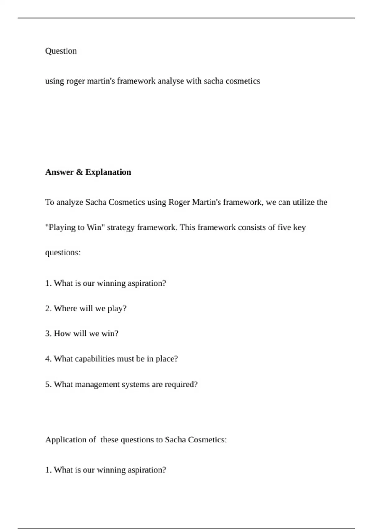 using roger martinQuestionusing roger martin's framework analyse with sacha cosmeticsAnswer & ExplanationTo analyze Sacha Cosmetics using Roger Martin's framework, we can utilize the "Playing to Win" strategy framework. This framework consists of five key questions:1. What is our winning aspiration?2. Where will we play?3. How will we win?4. What capabilities must be in place?5. What management systems are required?Application of  these questions to Sacha Cosmetics:1. What is our winning aspiration?Sacha Cosmetics' Winning Aspiration:Sacha Cosmetics aspires to be the leading global brand in providing high-quality, affordable makeup products that cater to diverse skin tones, particularly focusing on women of color. The company aims to be recognized for its inclusivity and commitment to beauty for all.2. Where will we play?Sacha Cosmetics' Market Focus:- Geographic Scope: Initially focused on the Caribb