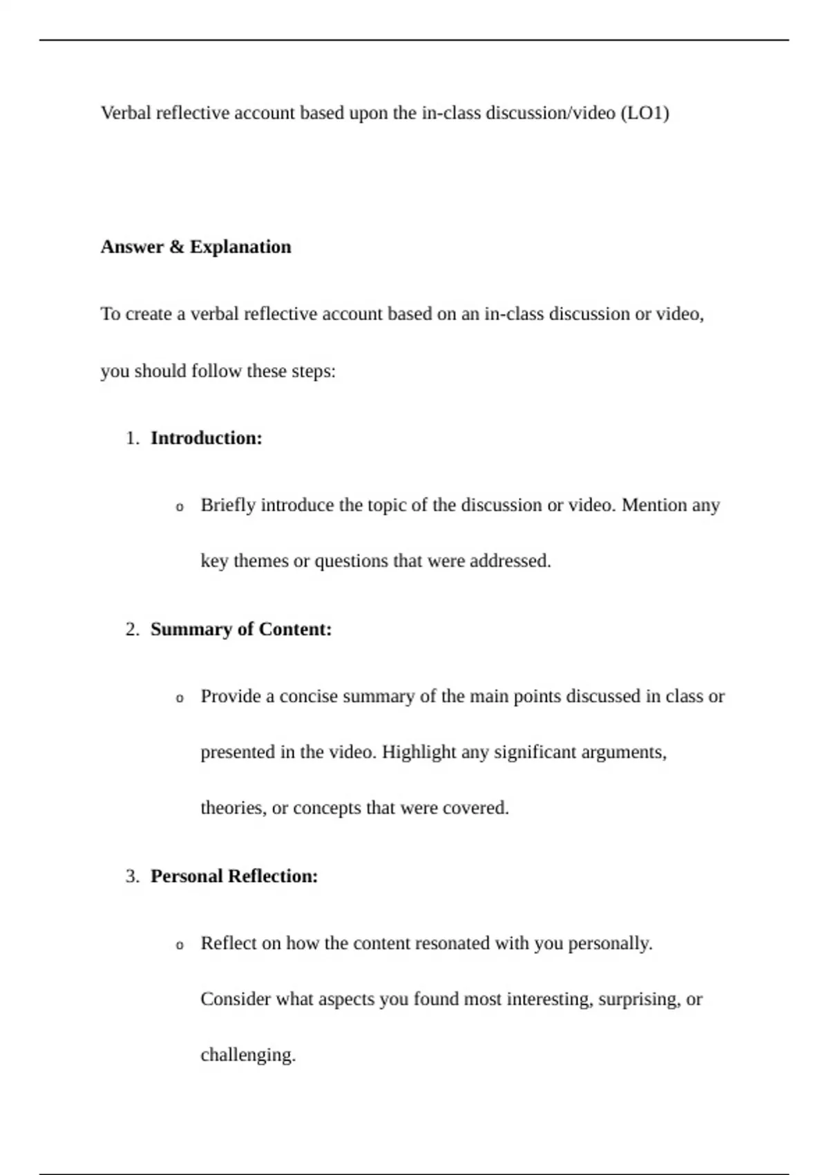 To create a verbal reflective account based on an in-class discussion or video,