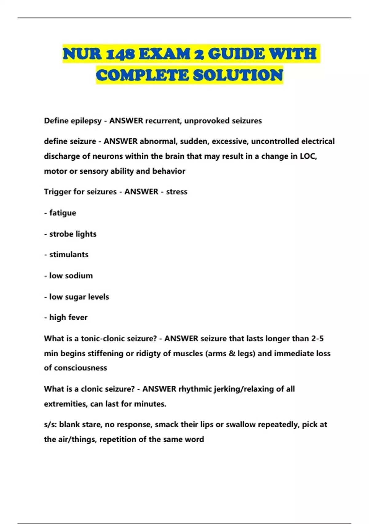 NUR 148 EXAM 2 GUIDE WITH COMPLETE SOLUTION...