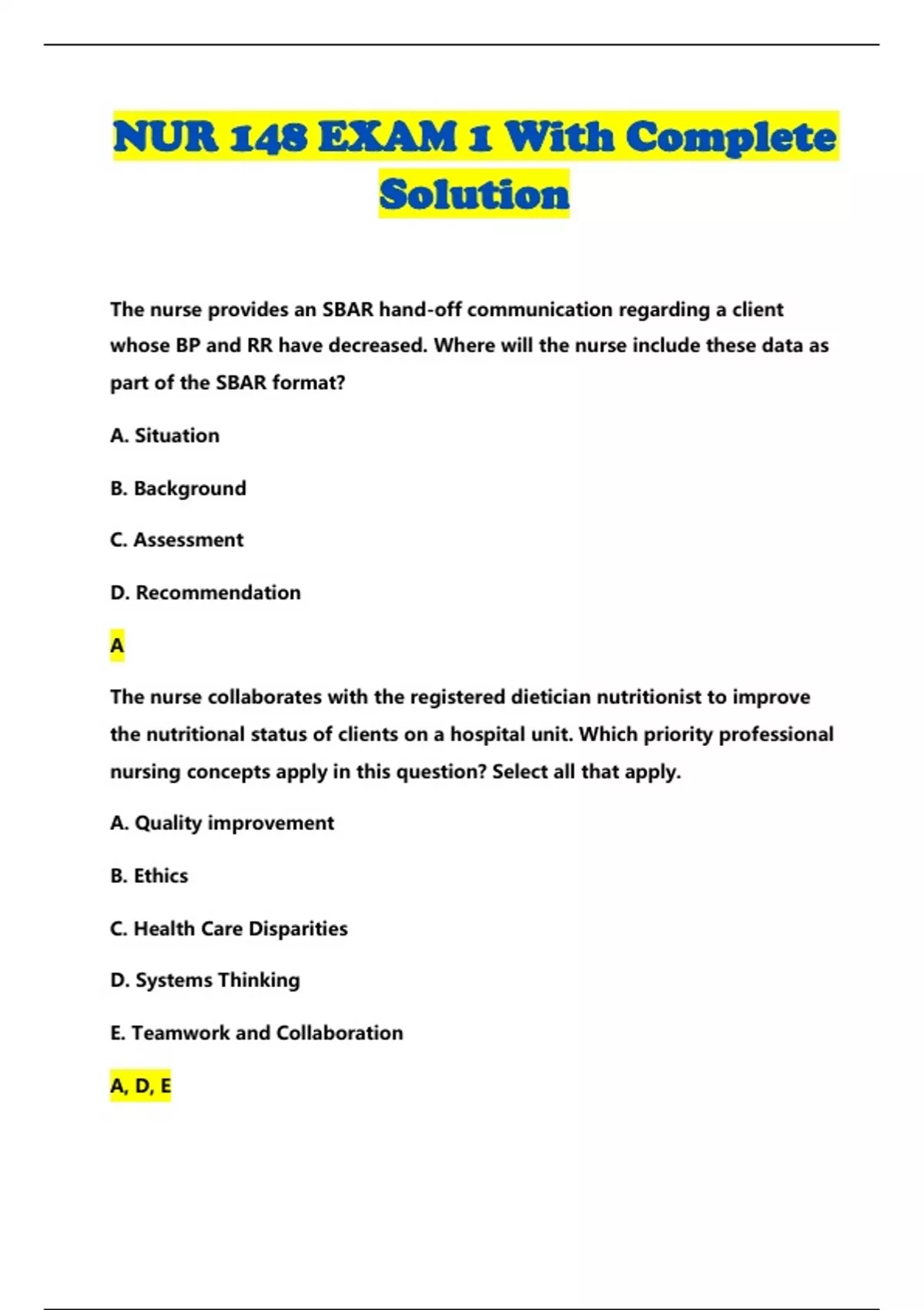 NUR 148 EXAM 1 With Complete
