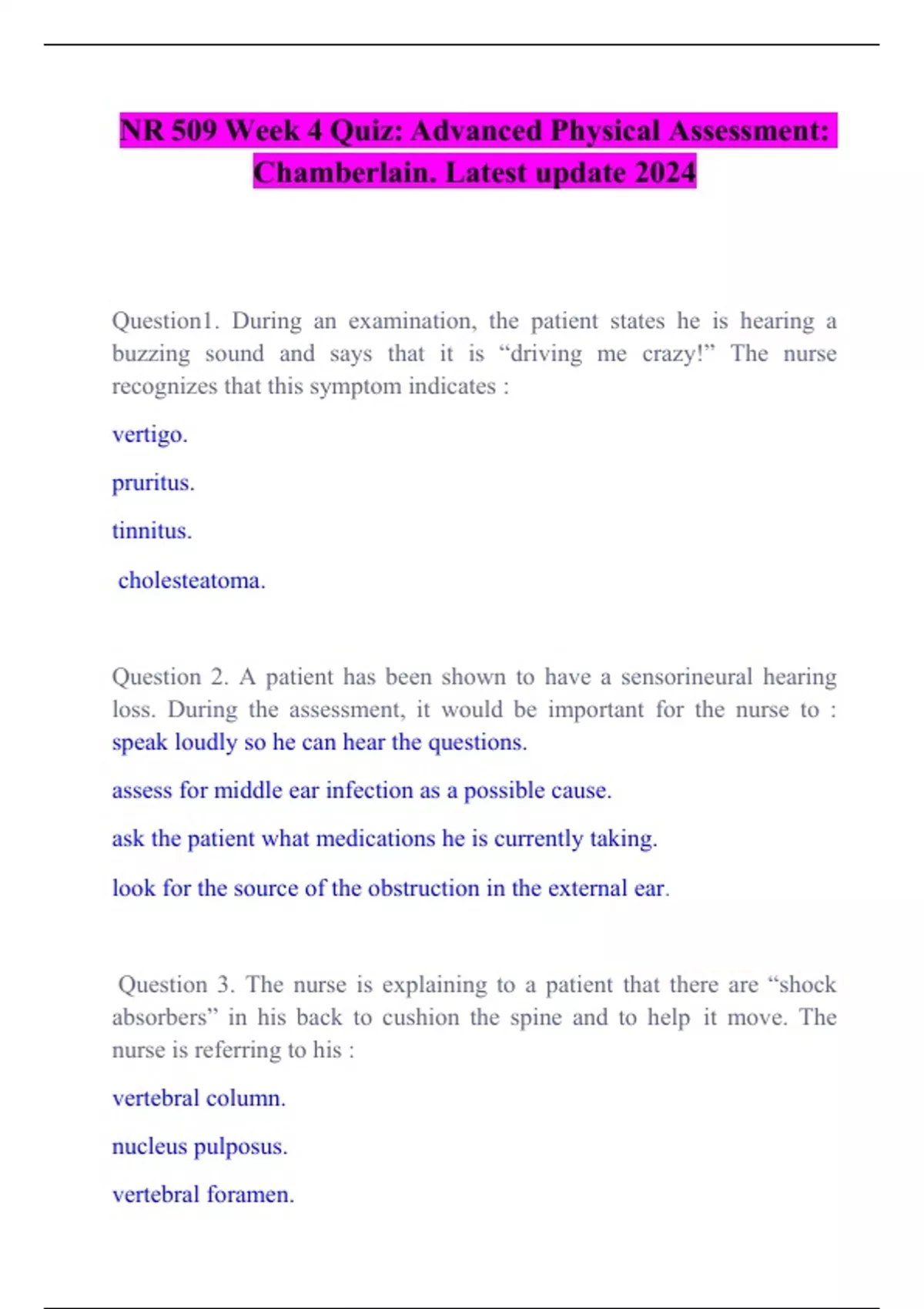 NR 509 Week 4 Quiz: Advanced Physical Assessment: