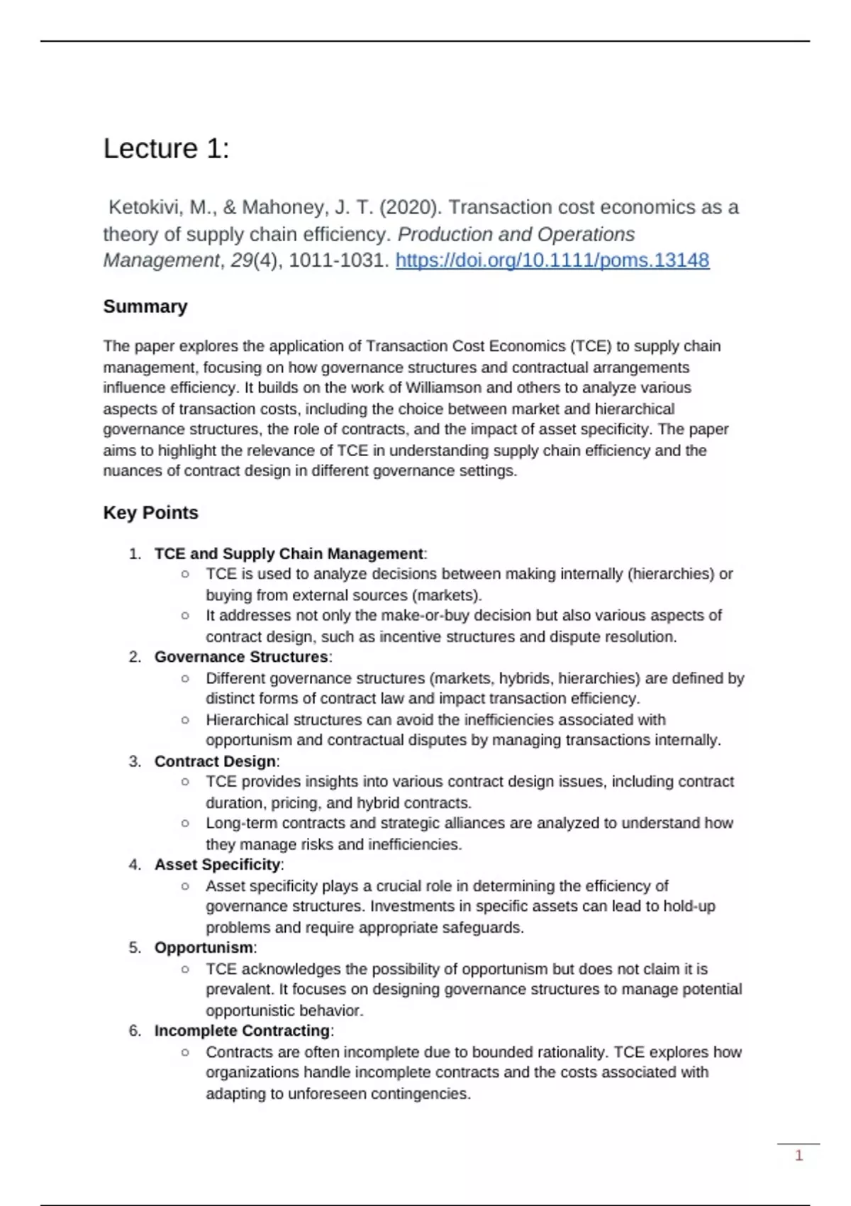 governance structures, the role of contracts, and the impact of asset specificity. The paper