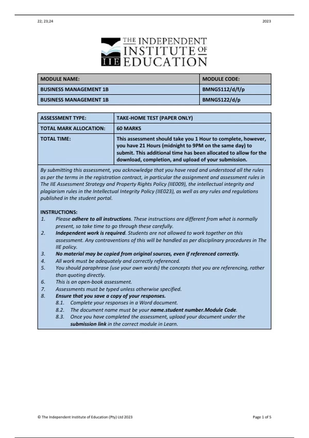 © The Independent Institute of Education (Pty) Ltd 2023 Page 1 of 5