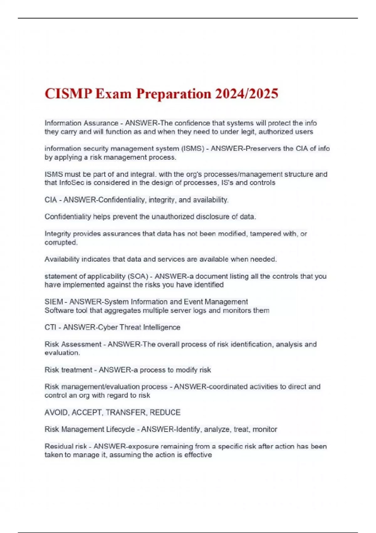 CISMP Exam Preparation 2024/2025 Information Assurance - ANSWER-The confidence that systems will protect the info they carry and will function as and when they need to under legit, authorized users information security management system (ISMS) - ANSWER-Preservers the CIA of info by applying a risk management process. ISMS must be part of and integral. with the org's processes/management structure and that InfoSec is considered in the design of processes, IS's and controls CIA - ANSWER-Confidentiality, integrity, and availability. Confidentiality helps prevent the unauthorized disclosure of data. Integrity provides assurances that data has not been modified, tampered with, or corrupted. Availability indicates that data and services are available when needed. statement of applicability (SOA) - ANSWER-a document listing all the controls that you have implemented against the risks you have identified SIEM - ANSWER-System Information and Event Management Software tool that aggregates multiple server logs and monitors them CTI - ANSWER-Cyber Threat Intelligence Risk Assessment - ANSWER-The overall process of risk identification, analysis and evaluation. Risk treatment - ANSWER-a process to modify risk Risk management/evaluation process - ANSWER-coordinated activities to direct and control an org with regard to risk AVOID, ACCEPT, TRANSFER, REDUCE Risk Management Lifecycle - ANSWER-Identify, analyze, treat, monitor Residual risk - ANSWER-exposure remaining from a specific risk after action has been taken to manage it, assuming the action is effective Risk appetite - ANSWER-level of risk an org is prepared to accept, tolerate or be exposed to Asset value - ANSWER-How much the business will lose if the asset is compromised, how much it is worth in business terms Qualitative Risk Analysis - ANSWER-Rating risk on high, medium, low basis e.g traffic light system, red amber green Quantitative risk analysis - ANSWER-Uses a formal scoring methodology based on complex mathematical formula and gathering of data Impact - ANSWER-the max consequence to the business of the risk occurring Likelihood - ANSWER-the probability that the risk will occur or the threat will come to pass Cost benefit analysis - ANSWER-must be done before implementing a control Risk Treatment plan - ANSWER-Plan -> Do -> Check -> Act risk assessment review - ANSWER-Needs regular review, at least Annually. Once implanted effectively look to do mid-year as well. Types of controls - ANSWER-Directive, preventative, detective, corrective Directive Control - ANSWER-putting in place some form of instruction e.g. policy/contract Preventative control - ANSWER-Stopping something from happening, typically reduce likelihood Continues.......