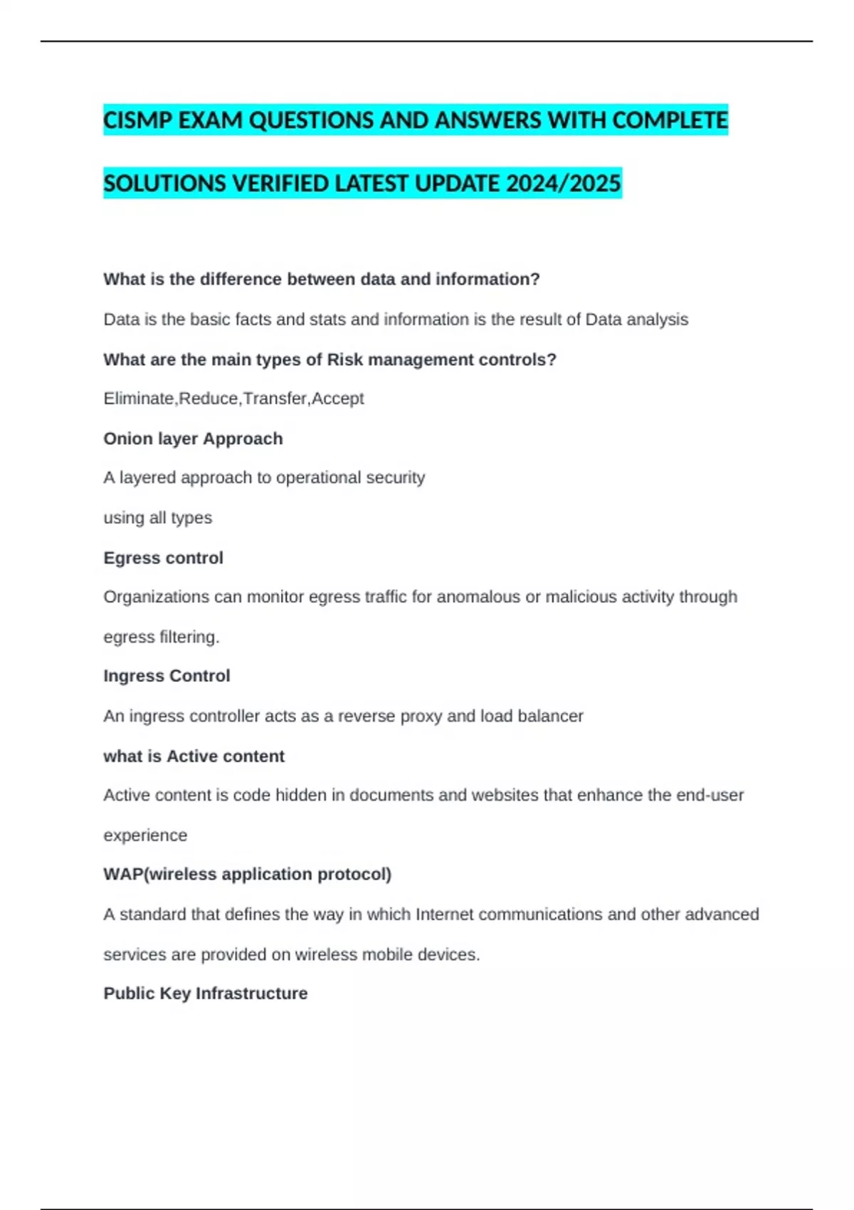 CISMP EXAM QUESTIONS AND ANSWERS WITH COMPLETE SOLUTIONS VERIFIED LATEST UPDATE 2024/2025 What is the difference between data and information? Data is the basic facts and stats and information is the result of Data analysis What are the main types of Risk management controls? Eliminate,Reduce,Transfer,Accept Onion layer Approach A layered approach to operational security using all types Egress control Organizations can monitor egress traffic for anomalous or malicious activity through egress filtering. Ingress Control An ingress controller acts as a reverse proxy and load balancer what is Active content Active content is code hidden in documents and websites that enhance the end-user experience WAP(wireless application protocol) A standard that defines the way in which Internet communications and other advanced services are provided on wireless mobile devices. Public Key Infrastructure a combination of policies, procedures and technology needed to manage digital certificates in a public key cryptography scheme. What is Network sniffing? A passive technique that monitors network communication, decodes protocols, and examines headers and payloads for information of interest. Main uses of cryptography confidentiality and integrity of both data in transit as well as data at rest. It can also authenticate senders and recipients to one another and protect against repudiation. What are the 3 protocols used in IPsec? Authentication Header Encapsulating Security Payload Enhanced Cryptographic Algorithms Which of the following lists UK Government data classifications (in decreasing order)? a) TOP SECRET, SECRET, OFFICIAL b) TOP SECRET, SECRET, OFFICIAL-SENSITIVE, PUBLIC c) TOP SECRET, SECRET, OFFICIAL, PUBLIC A Which of the following is a principle of data processing under GDPR? a) Purpose limitation b) Data minimisation c) Storage limitation d)All of above