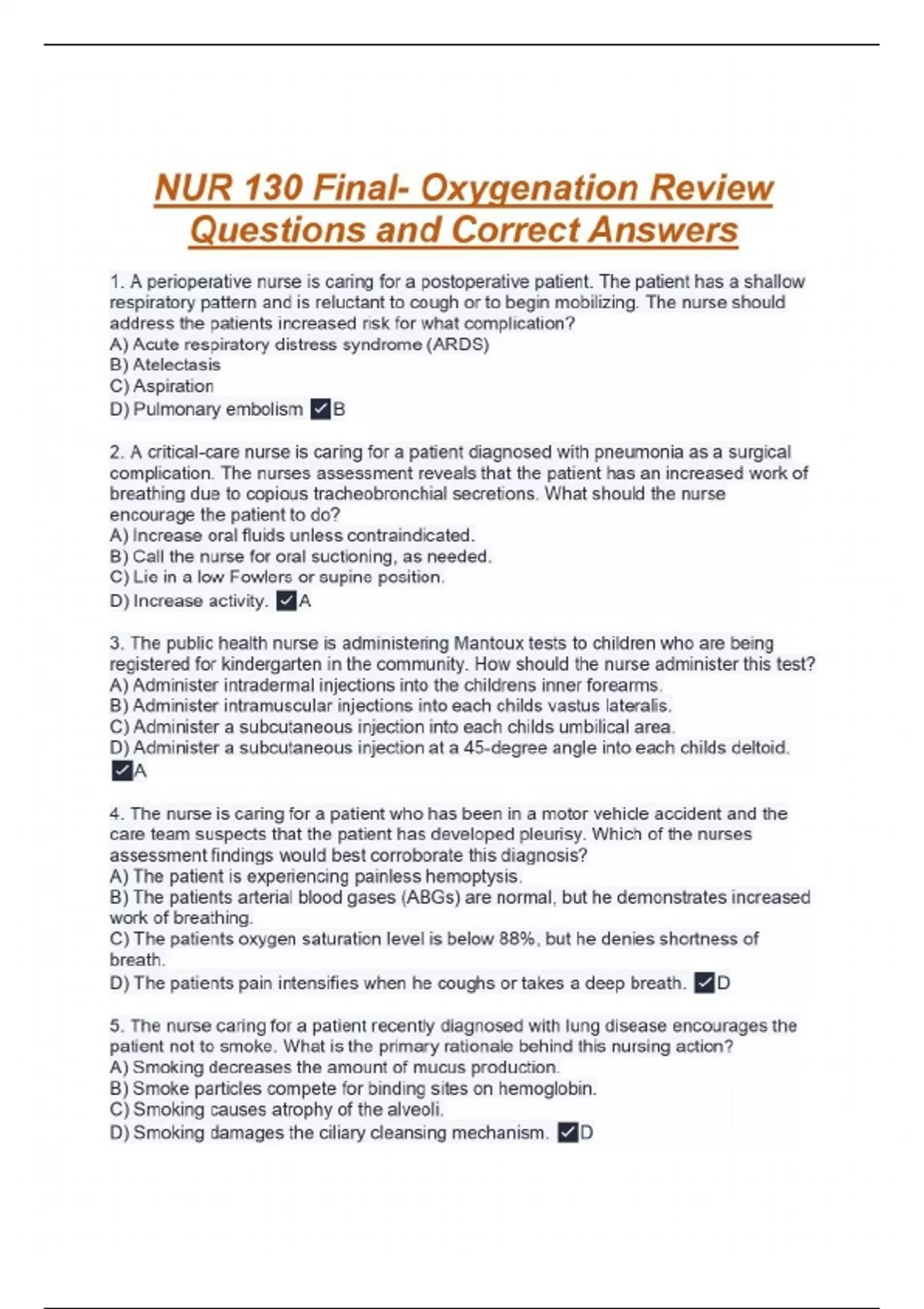 NUR 130 Final- Oxygenation Review Questions and Correct Answers