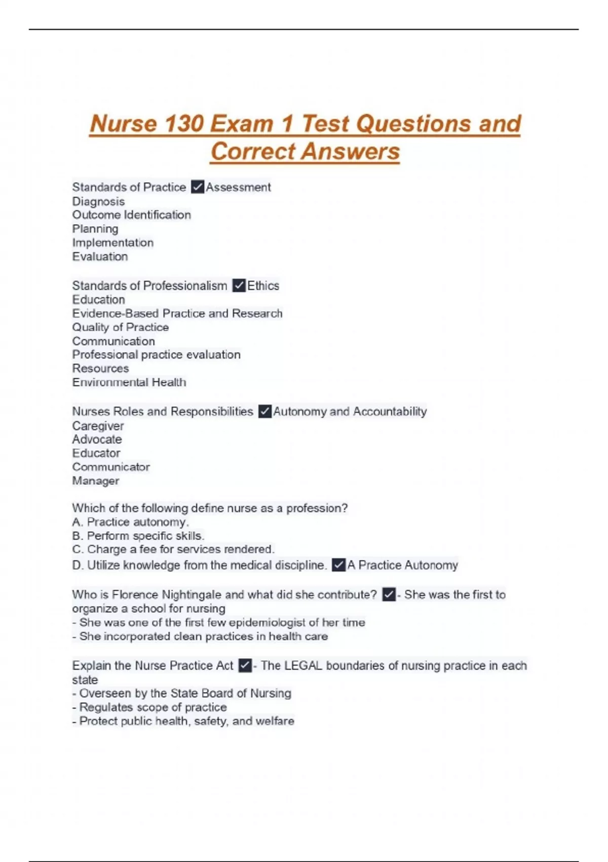 Nurse 130 Exam 1 Test Questions and Correct Answers