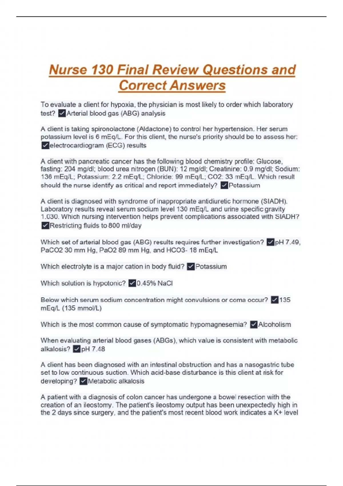 To evaluate a client for hypoxia, the physician is most likely to order which laboratory test? Arterial blood gas (ABG) analysis A client is taking spironolactone (Aldactone) to control her hypertension. Her serum potassium level is 6 mEq/L. For this client, the nurse's priority should be to assess her: electrocardiogram (ECG) results A client with pancreatic cancer has the following blood chemistry profile: Glucose, fasting: 204 mg/dl; blood urea nitrogen (BUN): 12 mg/dl; Creatinine: 0.9 mg/dl; Sodium: 136 mEq/L; Potassium: 2.2 mEq/L; Chloride: 99 mEq/L; CO2: 33 mEq/L. Which result should the nurse identify as critical and report immediately? Potassium A client is diagnosed with syndrome of inappropriate antidiuretic hormone (SIADH). Laboratory results reveal serum sodium level 130 mEq/L and urine specific gravity 1.030. Which nursing intervention helps prevent complications associated with SIADH? Restricting fluids to 800 ml/day Which set of arterial blood gas (ABG) results requires further investigation? pH 7.49, PaCO2 30 mm Hg, PaO2 89 mm Hg, and HCO3- 18 mEq/L Which electrolyte is a major cation in body fluid? Potassium Which solution is hypotonic? 0.45% NaCl Below which serum sodium concentration might convulsions or coma occur? 135 mEq/L (135 mmol/L) Which is the most common cause of symptomatic hypomagnesemia? Alcoholism When evaluating arterial blood gases (ABGs), which value is consistent with metabolic alkalosis? pH 7.48 A client has been diagnosed with an intestinal obstruction and has a nasogastric tube set to low continuous suction. Which acid-base disturbance is this client at risk for developing? Metabolic alkalosis A patient with a diagnosis of colon cancer has undergone a bowel resection with the creation of an ileostomy. The patient's ileostomy output has been unexpectedly high in the 2 days since surgery, and the patient's most recent blood work indicates a K+ level of 2.7 mEq/L. This potassium level should prompt the nurse to assess for which of the following physical manifestations? Fatigue, cramps, and weakness