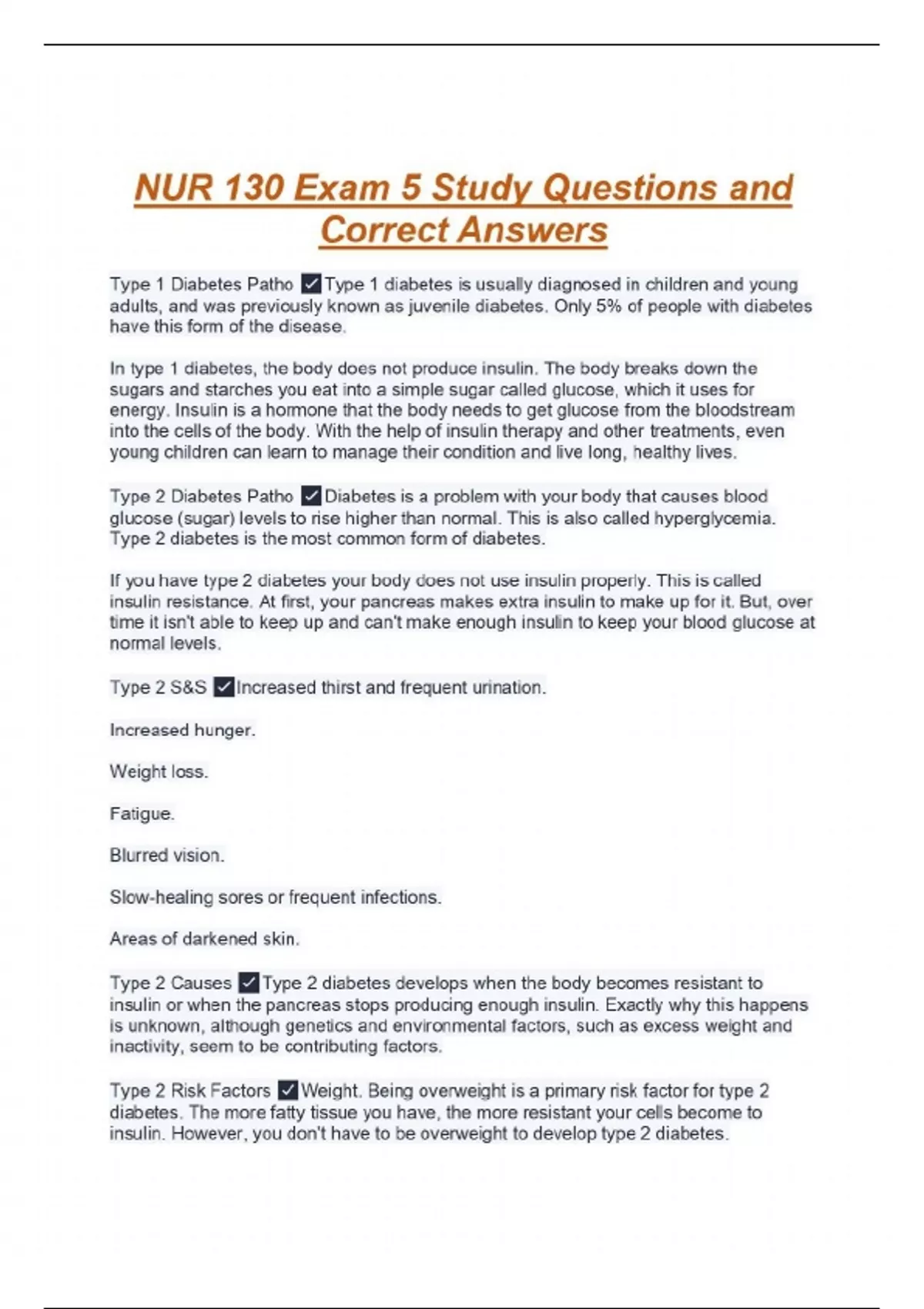 Type 1 Diabetes Patho Type 1 diabetes is usually diagnosed in children and young adults, and was previously known as juvenile diabetes. Only 5% of people with diabetes have this form of the disease. In type 1 diabetes, the body does not produce insulin. The body breaks down the sugars and starches you eat into a simple sugar called glucose, which it uses for energy. Insulin is a hormone that the body needs to get glucose from the bloodstream into the cells of the body. With the help of insulin therapy and other treatments, even young children can learn to manage their condition and live long, healthy lives. Type 2 Diabetes Patho Diabetes is a problem with your body that causes blood glucose (sugar) levels to rise higher than normal. This is also called hyperglycemia. Type 2 diabetes is the most common form of diabetes. If you have type 2 diabetes your body does not use insulin properly. This is called insulin resistance. At first, your pancreas makes extra insulin to make up for it. But, over time it isn't able to keep up and can't make enough insulin to keep your blood glucose at normal levels. Type 2 S&S Increased thirst and frequent urination. Increased hunger. Weight loss. Fatigue. Blurred vision. Slow-healing sores or frequent infections. Areas of darkened skin. Type 2 Causes Type 2 diabetes develops when the body becomes resistant to insulin or when the pancreas stops producing enough insulin. Exactly why this happens is unknown, although genetics and environmental factors, such as excess weight and inactivity, seem to be contributing factors. Type 2 Risk Factors Weight. Being overweight is a primary risk factor for type 2 diabetes. The more fatty tissue you have, the more resistant your cells become to insulin. However, you don't have to be overweight to develop type 2 diabetes