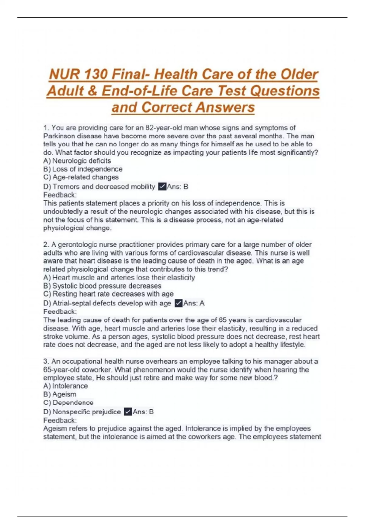 1. You are providing care for an 82-year-old man whose signs and symptoms of Parkinson disease have become more severe over the past several months. The man tells you that he can no longer do as many things for himself as he used to be able to do. What factor should you recognize as impacting your patients life most significantly? A) Neurologic deficits B) Loss of independence C) Age-related changes D) Tremors and decreased mobility Ans: B Feedback: This patients statement places a priority on his loss of independence. This is undoubtedly a result of the neurologic changes associated with his disease, but this is not the focus of his statement. This is a disease process, not an age-related physiological change. 2. A gerontologic nurse practitioner provides primary care for a large number of older adults who are living with various forms of cardiovascular disease. This nurse is well aware that heart disease is the leading cause of death in the aged. What is an age related physiological change that contributes to this trend? A) Heart muscle and arteries lose their elasticity B) Systolic blood pressure decreases C) Resting heart rate decreases with age D) Atrial-septal defects develop with age Ans: A Feedback: The leading cause of death for patients over the age of 65 years is cardiovascular disease. With age, heart muscle and arteries lose their elasticity, resulting in a reduced stroke volume. As a person ages, systolic blood pressure does not decrease, rest heart rate does not decrease, and the aged are not less likely to adopt a healthy lifestyle. 3. An occupational health nurse overhears an employee talking to his manager about a 65-year-old coworker. What phenomenon would the nurse identify when hearing the employee state, He should just retire and make way for some new blood.? A) Intolerance B) Ageism C) Dependence D) Nonspecific prejudice Ans: B Feedback: Ageism refers to prejudice against the aged. Intolerance is implied by the employees statement, but the intolerance is aimed at the coworkers age. The employees statement does not raise concern about dependence. The prejudice exhibited in the statement is very specific. 4. The nurse is caring for a 65-year-old patient who has previously been diagnosed with hypertension. Which of the following blood pressure readings represents the threshold between high-normal blood pressure and hypertension? A) 140/90 mm Hg B) 145/95 mm Hg C) 150/100 mm Hg D) 160/100 mm Hg Ans: A Feedback: Hypertension is the diagnosis given when the blood pressure is greater than 140/90 mm Hg. This makes the other options incorrect. 5. You are the nurse caring for an 85-year-old patient who has been hospitalized for a fractured radius. The patients daughter has accompanied the patient to the hospital and asks you what her father can do for his very dry skin, which has become susceptible to cracking and shearing. What would be your best response? A) He should likely take showers rather than baths, if possible. B) Make sure that he applied sunscreen each morning. C) Dry skin is an age-related change that is largely inevitable. D) Try to help your father increase his intake of dairy products. Ans: A Feedback: Showers are less drying than hot tubs baths. Sun exposure should indeed be limited, but daily application of sunscreen is not necessary for many patients. Dry skin is an age-related change, but this does not mean that no appropriate interventions exist to address it. Dairy intake in unrelated. 6. An elderly patient has come in to the clinic for her twice-yearly physical. The patient tells the nurse that she is generally enjoying good health, but that she has been having occasional episodes of constipation over the past 6 months. What intervention should the nurse first suggest? A) Reduce the amount of stress she currently experiences B) Increase carbohydrate intake and reduce protein intake C) Take herbal laxatives, such as senna, each night at bedtime D) Increase daily intake of water Ans: D