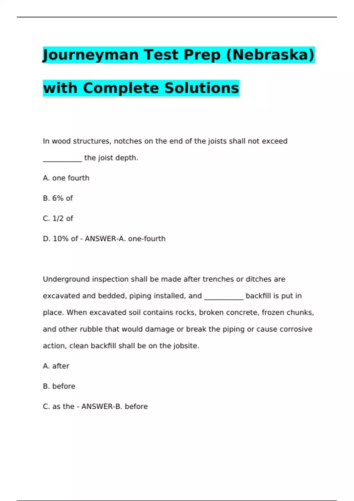 Journeyman Test Prep (Nebraska) with Complete SolutionsJourneyman Test Prep (Nebraska) with Complete SolutionsJourneyman Test Prep (Nebraska) with Complete Solutions In wood structures, notches on the end of the joists shall not exceed ___________ the joist depth. A. one fourth B. 6% of C. 1/2 of D. 10% of - ANSWER-A. one-fourth Underground inspection shall be made after trenches or ditches are excavated and bedded, piping installed, and ___________ backfill is put in place. When excavated soil contains rocks, broken concrete, frozen chunks, and other