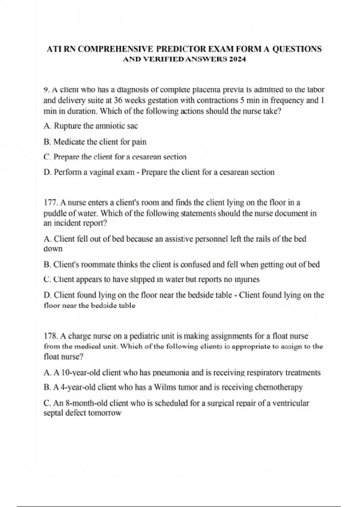 ATI RN COMPREHENSIVE PREDICTOR EXAM FORM A QUESTIONS AND VERIFIED ANSWERS 2024