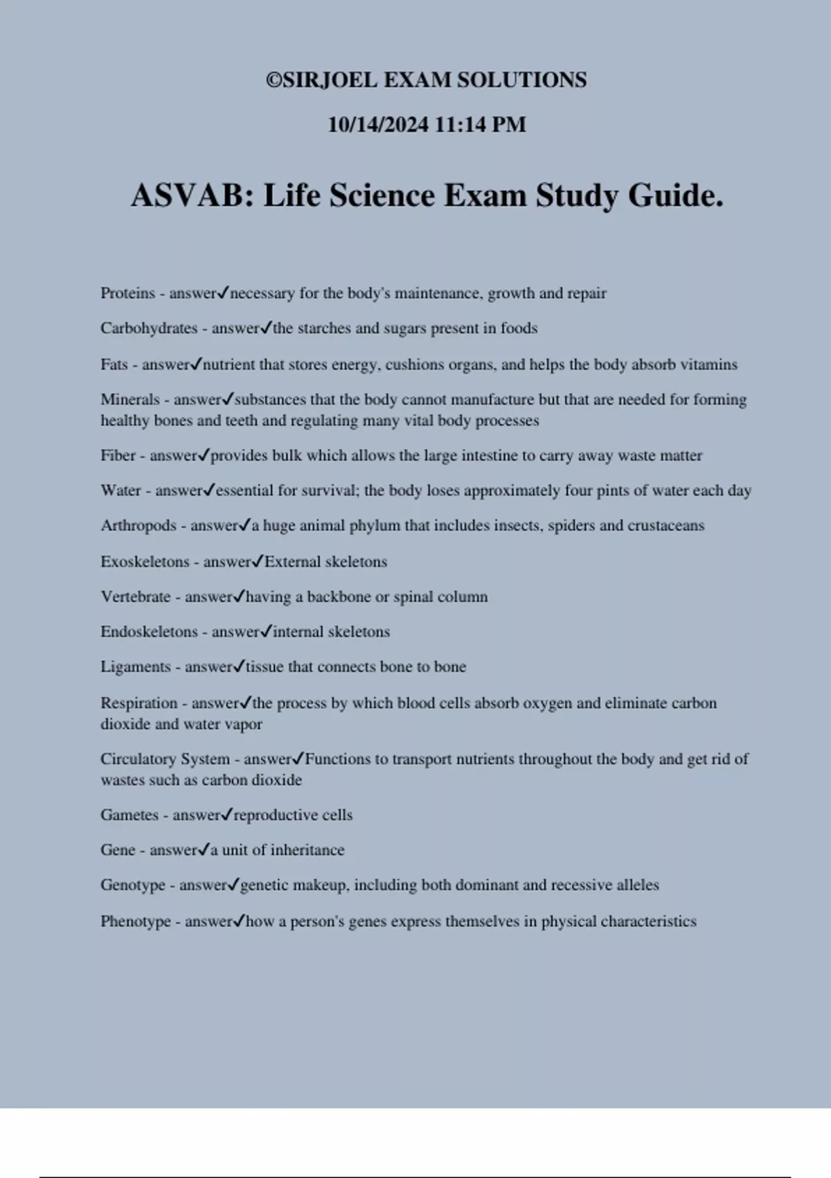 ©SIRJOEL EXAM SOLUTIONS 10/14/2024 11:14 PM ASVAB: Life Science Exam Study Guide. Proteins - answernecessary for the body's maintenance, growth and repair Carbohydrates - answerthe starches and sugars present in foods Fats - answernutrient that stores energy, cushions organs, and helps the body absorb vitamins Minerals - answersubstances that the body cannot manufacture but that are needed for forming healthy bones and teeth and regulating many vital body processes Fiber - answerprovides bulk which allows the large intestine to carry away waste matter Water - answeressential for survival; the body loses approximately four pints of water each day Arthropods - answera huge animal phylum that includes insects, spiders and crustaceans Exoskeletons - answerExternal skeletons Vertebrate - answerhaving a backbone or spinal column Endoskeletons - answerinternal skeletons Ligaments - answertissue that connects bone to bone Respiration - answerthe process by which blood cells absorb oxygen and eliminate carbon dioxide and water vapor Circulatory System - answerFunctions to transport nutrients throughout the body and get rid of wastes such as carbon dioxide Gametes - answerreproductive cells Gene - answera unit of inheritance Genotype - answergenetic makeup, including both dominant and recessive alleles Phenotype - answerhow a person's gene