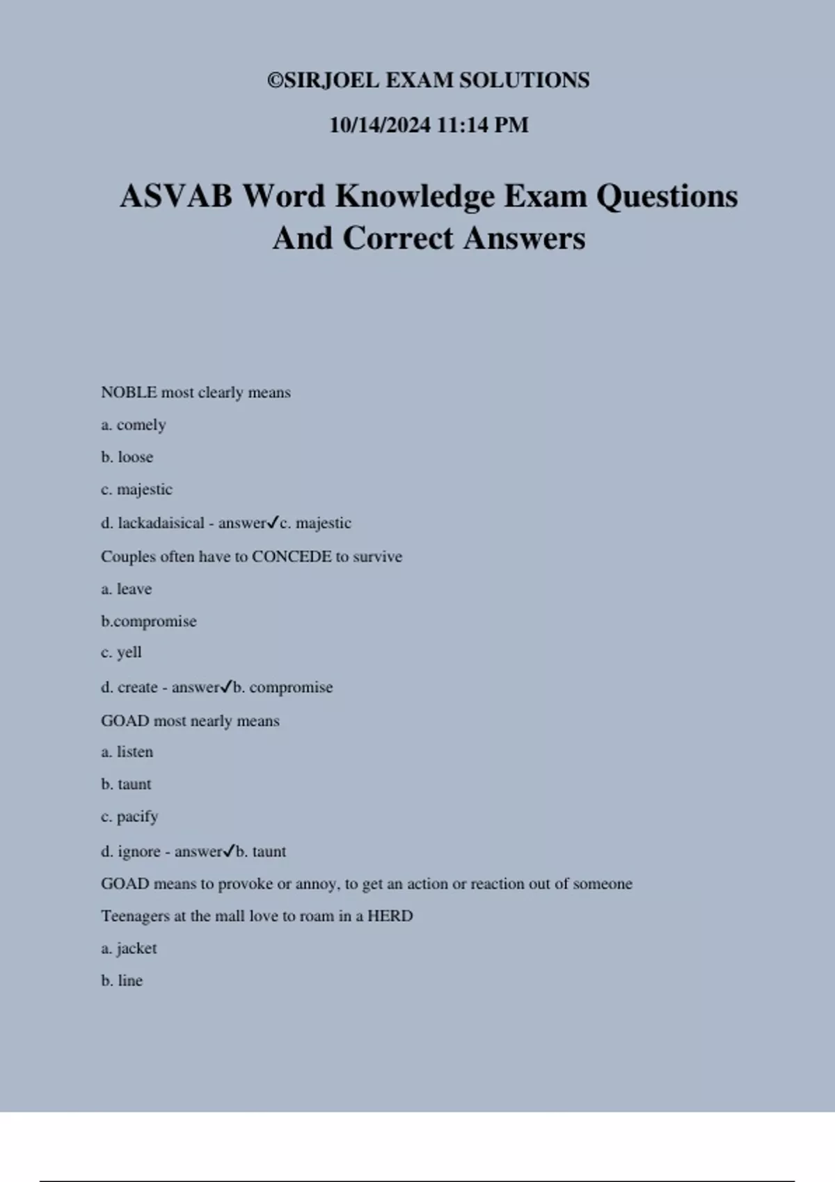 ASVAB Word Knowledge Exam Questions And Correct Answers NOBLE most clearly means a. comely b. loose c. majestic d. lackadaisical - answerc. majestic Couples often have to CONCEDE to survive a. leave omise c. yell d. create - answerb. compromise GOAD most nearly means a. listen b. taunt c. pacify d. ignore - answerb. taunt GOAD means to provoke or annoy, to get an action or reaction out of someone Teenagers at the mall love to roam in a HERD a. jacket b. line ©SIRJOEL EXAM SOLUTIONS 10/14/2024 11:14 PM c. pack d. ratio - answerc. pack Panicking in an emergency is not a VIABLE response for an EMT a. total b. collective c. lucid d. reasonable - answerd. reasonable VIABLE means capable of working successfully JUDICIOUS most nearly means a. accessible b. cold c. fair d. talkative - answerc. fair JUDICIOUS means, having, showing, or done with good judgment or sense. Think of the law, and branches of government. HESITATING in a time of crisis can often lead to failure a. broadening b. creating c. leaving d. pausing - answerd. pausing Applicants who insist on FALSIFYING information ruin the process for everyone a. fabricating b. listing c. furthering d. taking on - answera. fabricating FALSIFYING means to alter or change information, so that it is misleading ©SIRJOEL EXAM SOLUTIONS 10/14/2024 11:14 PM FABRICATING means to make up for the purpose of deception HOLLOW most nearly means a. dangerous b. potent c. empty d. superb - answerc. empty COAX most nearly means a. advise b. trade c. plead d. grace - answerc. plead COAX means to persuade gradually or by flattery to do something PLEAD means to use argument or persuasion, as with a person, or against something The MONOTONOUS speech left them all feeling sleepy a. telling b. boring c. caustic d. hilarious - answerb. boring MONOTONOUS means lacking in variety; unvarying A student's CONSTERNATION may be due to bad teachers a. desires b. inability c. confusion d. behavior - answerc. confusion CONSTERNATION means a sudden, alarming amazement or dread that results in utter confusion