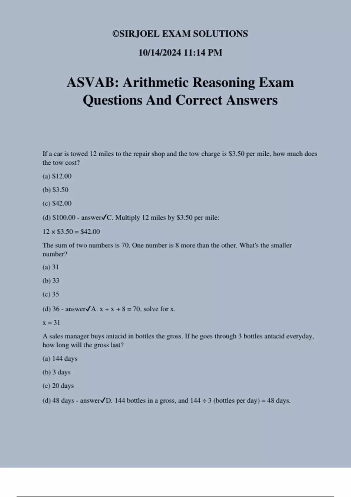 ASVAB: Arithmetic Reasoning Exam Questions And Correct Answers If a car is towed 12 miles to the repair shop and the tow charge is $3.50 per mile, how much does the tow cost? (a) $12.00 (b) $3.50 (c) $42.00 (d) $100.00 - answerC. Multiply 12 miles by $3.50 per mile: 12 × $3.50 = $42.00 The sum of two numbers is 70. One number is 8 more than the other. What's the smaller number? (a) 31 (b) 33 (c) 35 (d) 36 - answerA. x + x + 8 = 70, solve for x. x = 31 A sales manager buys antacid in bottles the gross. If he goes through 3 bottles antacid everyday, how long will the gross last? (a) 144 days (b) 3 days (c) 20 days (d) 48 days - answerD. 144 bottles in a gross, and 144 ÷ 3 (bottles per day) = 48 days. ©SIRJOEL EXAM SOLUTIONS 10/14/2024 11:14 PM Jenny's test grades are 93,89, 96, and 98. If she wishes to raise her average to 95, what does she need to score on her next test? (a) 100 (b) 99 (c) 97 (d) 95 - answerB. x = the unknown score. (93 + 89 + 96 + 98 + x) ÷ 5 or (376 + x) ÷ 5. Now solve for x A waitress earns an average of 12% of the cost of the food she serves. If she serves $375 worth of food in one evening, how much money in tips will she earn on average? (a) $37 (b) $45 (c) $42 (d) $420 - answerB. Multiply the amount spent on drinks, $375, by 12% (or 0.12) to determine the amount of tips: $375 × 0.12 = $45 How many square feet of carpeting are needed to carpet a 12-foot × 12-foot room? (a) 24 (b) 120 (c) 48 (d) 144 - answerD. To determine square footage multiply length by width 12 × 12 = 144 sq feet Joe received an hourly wage of $8.15. His boss gave him a 7% raise. How much does Joe make per hour now? (a) $0.57 (b) $8.90 (c) $8.72 (d) $13.85 - answerC.To calculate the new wage first multiply $8.15 × 0.07 = $0.57. Then add that to the original wage,