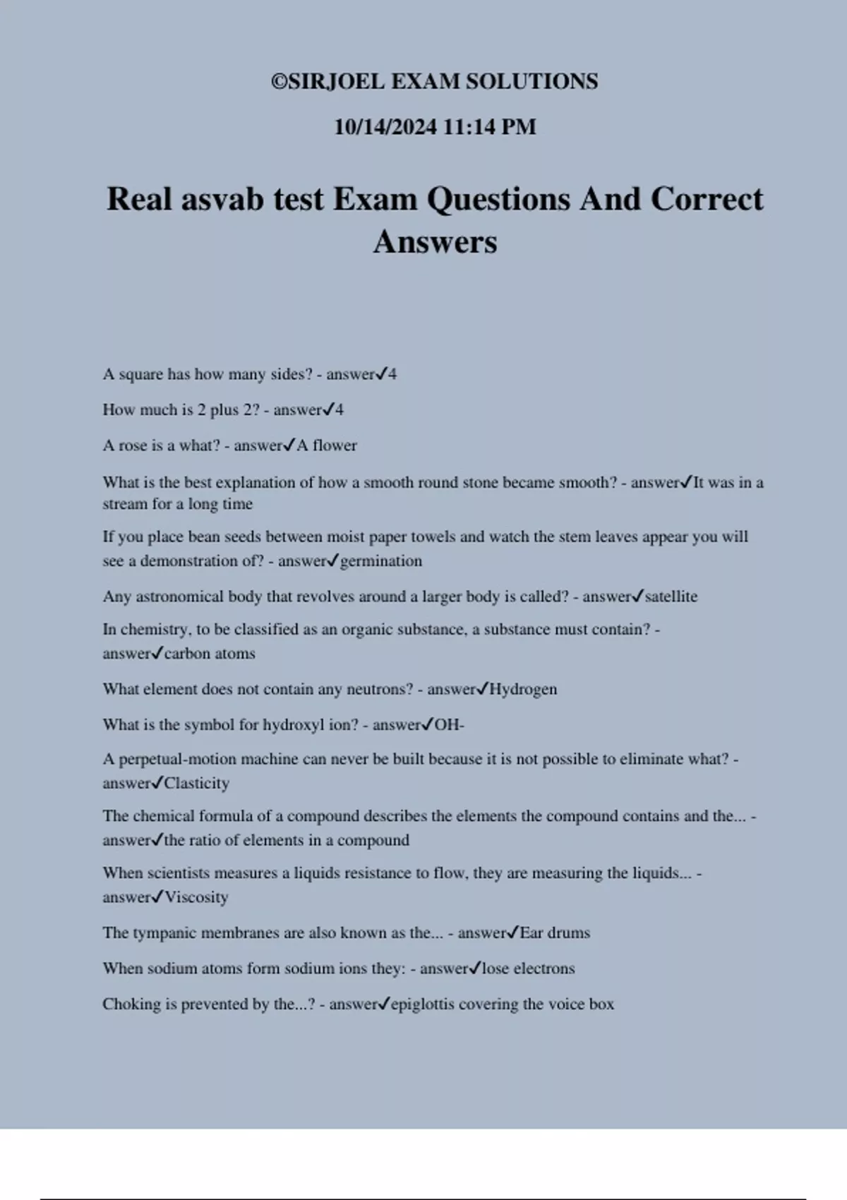 Real asvab test Exam Questions And Correct Answers A square has how many sides? - answer4 How much is 2 plus 2? - answer4 A rose is a what? - answerA flower What is the best explanation of how a smooth round stone became smooth? - answerIt was in a stream for a long time If you place bean seeds between moist paper towels and watch the stem leaves appear you will see a demonstration of? - answergermination Any astronomical body that revolves around a larger body is called? - answersatellite In chemistry, to be classified as an organic substance, a substance must contain? - answercarbon atoms What element does not contain any neutrons? - answerHydrogen What is the symbol for hydroxyl ion? - answerOH- A perpetual-motion machine can never be built because it is not possible to eliminate what? - answerClasticity The chemical formula of a compound describes the elements the compound contains and the... - answerthe ratio of elements in a compound When scientists measures a liquids resistance to flow, they are measuring the liquids... - answerViscosity The tympanic membranes are also known as the... - answerEar drums When sodium atoms form sodium ions they: - answerlose electrons Choking is prevented by the...? - answerepiglottis covering the voice box ©SIRJOEL EXAM SOLUTIONS 10/14/2024 11:14 PM Which of the following actions produce & chemical change? - answerAdding salt to the hot water Which of the following is a non-renewable resource? - answerCopper What are the 2 main gases that make up stars? - answerHydrogen and helium A radar is designed to report the track of an aircraft every second. If this radar reports 30 tracks in one minute, what percentage of the time did the radar track the aircraft? - answer50% Jerry walked a dog from 6:40am to 7:30pm one day. If he was paid at the rate of 6$ per hour, how much did he earn that day? - answer$5.00 A women is looking for a bigger square office. She finds an office twice the area of her current office. If the perimeter of her current office is 88 feet, how many square feet is the new office? - answer176 sq ft If the perimeter of a square garden is 84 feet, what is the area of the garden? - answer441sqft How many feet of chain fence are necessary to enclose a dog pen that is square and has an area of 64sqft - answer32 The pet store had 6 puppies selling for $104 each and 12 kittens selling for $24 each. Today, only 2 puppies and 8 kittens we're left. In dollar terms, what was the ratio of sales of puppies and kittens? - answer13 to 3 The price of salmon at a fish market is $5.40 per pound. This is 150% of it's cost at a supermarket. How much would it cost per pound at a supermarket? - answer$3.60 A train goes twice as fast downhill as it can go uphill, and 2/3 as fast uphill as it can go on level ground. If it goes 120 mph downhill, how long will it take to travel 45 miles on flat land? - answer1/2 hour Jamie just bought two boxes. The first box is square, with each side measuring 10 units, and is 4 units high. The second box is rectangular and has twice the volume of the square box. If the height of the second box is 5 units, and the width is 10 units, what is the length of the second box? - answer16 units Each August, a restaurant's rent is adjusted to the cost of living index. The rent has been 1,550 a month, and the cost of living index for this August was 3.7%. What is the new rent per month? - answer$1,607.35 There are 9 red and 6 green marbles in a bag. A child reaches in the bag and randomly takes one marble. What is the probability pf that child getting a green marble? - answer.66