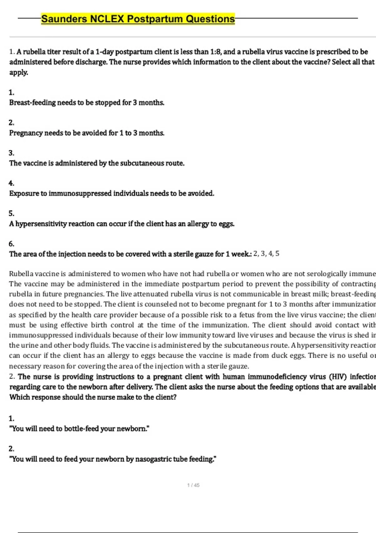1. A rubella titer result of a 1-day postpartum client is less than 1:8, and a rubella virus vaccine is prescribed to be
