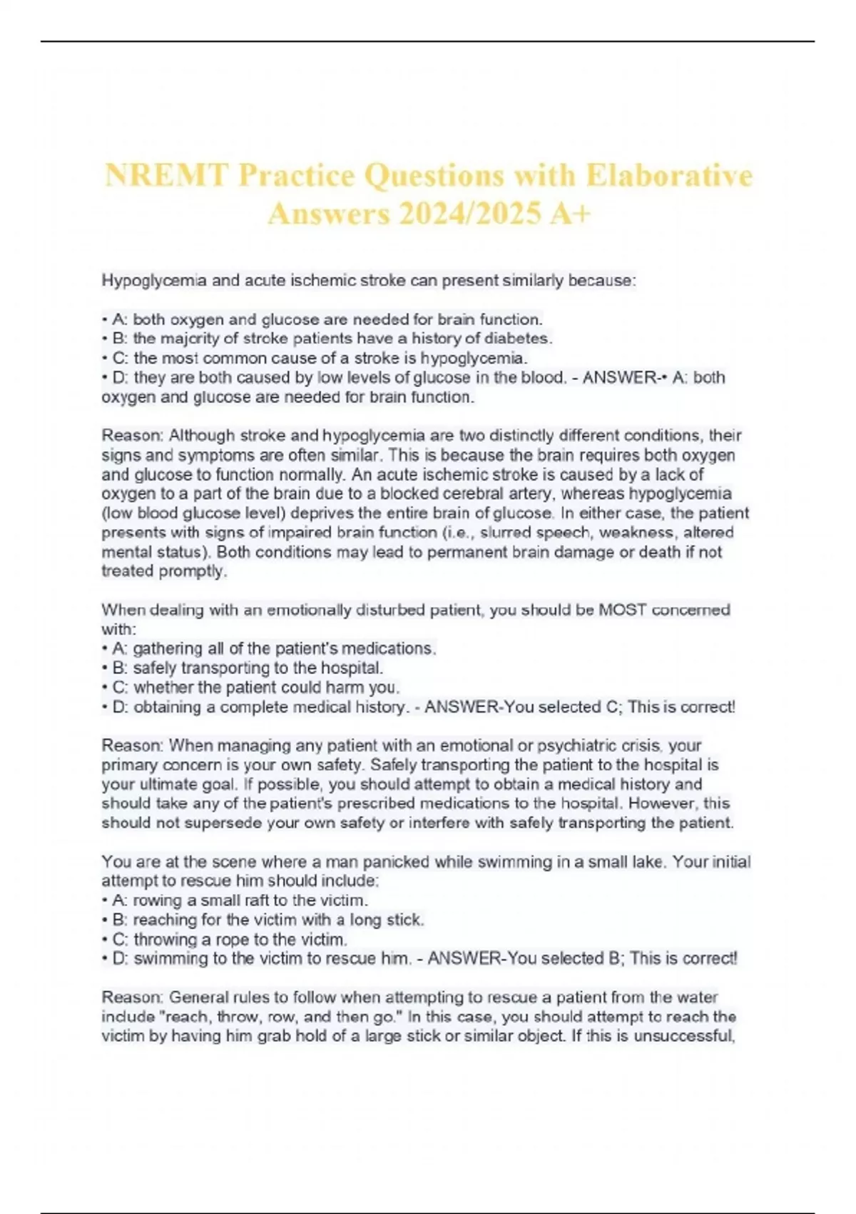 NREMT Practice Questions with Elaborative Answers 2024/2025 A+ Hypoglycemia and acute ischemic stroke can present similarly because: • A: both oxygen and glucose are needed for brain function. • B: the majority of stroke patients have a history of diabetes. • C: the most common cause of a stroke is hypoglycemia. • D: they are both caused by low levels of glucose in the blood. - ANSWER-• A: both oxygen and glucose are needed for brain function. Reason: Although stroke and hypoglycemia are two distinctly different conditions, their signs and symptoms are often similar. This is because the brain requires both oxygen and glucose to function normally. An acute ischemic stroke is caused by a lack of oxygen to a part of the brain due to a blocked cerebral artery, whereas hypoglycemia (low blood glucose level) deprives the entire brain of glucose. In either case, the patient presents with signs of impaired brain function (i.e., slurred speech, weakness, altered mental status). Both conditions may lead to permanent brain damage or death if not treated promptly. When dealing with an emotionally disturbed patient, you should be MOST concerned with: • A: gathering all of the patient's medications. • B: safely transporting to the hospital. • C: whether the patient could harm you. • D: obtaining a complete medical history. - ANSWER-You selected C; This is correct! Reason: When managing any patient with an emotional or psychiatric crisis, your primary concern is your own safety. Safely transporting the patient to the hospital is your ultimate goal. If possible, you should attempt to obtain a medical history and should take any of the patient's prescribed medications to the hospital. However, this should not supersede your own safety or interfere with safely transporting the patient. You are at the scene where a man panicked while swimming in a small lake. Your initial attempt to rescue him should include: • A: rowing a small raft to the victim. • B: reaching for the victim with a long stick. • C: throwing a rope to the victim. • D: swimming to the victim to rescue him. - ANSWER-You selected B; This is correct! Reason: General rules to follow when attempting to rescue a patient from the water include "reach, throw, row, and then go." In this case, you should attempt to reach the victim by having him grab hold of a large stick or similar object. If this is unsuccessful, throw the victim a rope or flotation device (if available). If these are not available, row to the patient in a small raft (if available). Going into the water to retrieve the victim is a last resort. The rescuer must be a strong swimmer because patients who are in danger of drowning are in a state of blind panic and will make every attempt to keep themselves afloat, even if it means forcing the rescuer underwater. How should you classify a patient's nature of illness if he or she has a low blood glucose level, bizarre behavior, and shallow breathing? • A: Behavioral emergency • B: Altered mental status • C: Respiratory emergency • D: Cardiac compromise - ANSWER-The correct answer is B; Reason: The nature of illness (NOI) is the medical equivalent to mechanism of injury (MOI). Altered mental status should be the suspected NOI in any patient with any fluctuation in level of consciousness, which can range from bizarre behavior to complete unresponsiveness. Causes of an altered mental status include hypo- or hyperglycemia, head trauma, stroke, behavioral crises, drug overdose, and shock, among others. A young female is unresponsive after overdosing on an unknown type of drug. Her respirations are slow and shallow and her pulse is slow and weak. Which of the following drugs is the LEAST likely cause of her condition? • A: Seconal • B: Heroin • C: Cocaine • D: Valium - ANSWER-The correct answer is C; Reason: Of the drugs listed, cocaine would be the least likely cause of the patient's condition. Cocaine is a central nervous system (CNS) stimulant; you would expect her to be hypertensive, tachycardic, tachypneic, and perhaps even violent. Heroin, Valium, and Seconal are all CNS depressants and could explain her condition. Heroin is an illegal narcotic (opiate), Valium is a benzodiazepine sedative-hypnotic drug, and Seconal is a barbiturate. Narcotics, benzodiazepines, and barbiturates are all CNS depressants. When taken in excess, they cause a decreased level of consciousness, respiratory depression, bradycardia, and hypotension. Activated charcoal is contraindicated for a patient who is: • A: conscious and alert and has ingested a large amount of Motrin. • B: emotionally upset and has ingested two bottles of aspirin. • C: agitated and claims to have ingested a bottle of Tylenol. • D: awake and alert and has swallowed a commercial drain cleaner. - ANSWER-You selected D; This is correct! Reason: Activated charcoal adsorbs (sticks to) many ingested substances, preventing them from being absorbed into the body by the stomach or intestines. In some cases, you may give activated charcoal to patients who have ingested certain substances, if approved by medical control or local protocol. Activated charcoal is contraindicated for patients who have ingested an acid or alkali (ie, drain cleaner) or a petroleum product (ie, gasoline), who have a decreased level of consciousness and cannot protect their own airway, or who are unable to swallow. The MOST obvious way to reduce heat loss from radiation and convection is to: • A: move away from a cold object. • B: increase metabolism by shivering. • C: wear a thick wind-proof jacket. • D: move to a warmer environment. - ANSWER-you selected D; This is correct! Reason: In a cold environment, the body has two ways of staying warm: generating heat (thermogenesis) and reducing heat loss. Radiation is the transfer of heat by radiant energy. The body can lose heat by radiation, such as when a person stands in a cold room. Convection occurs when heat is transfe