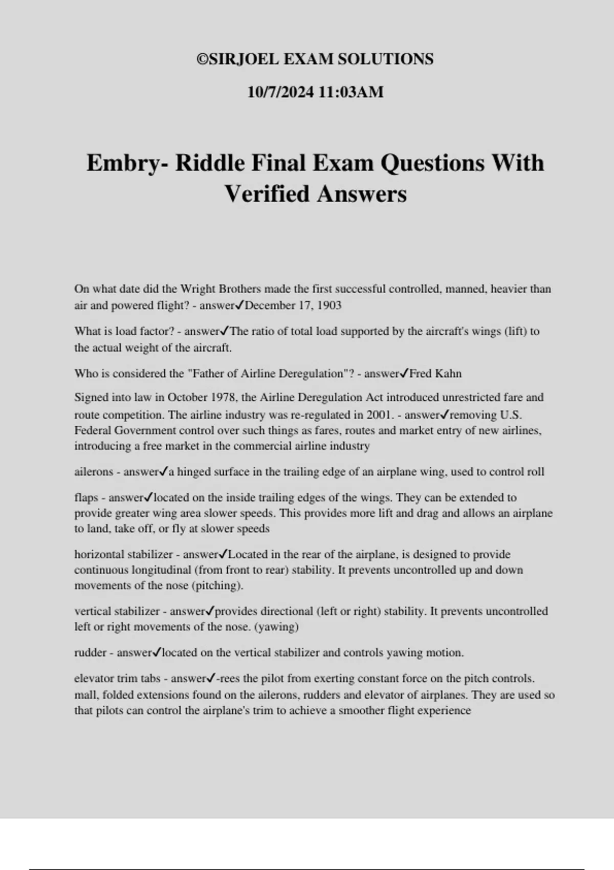 Embry- Riddle Final Exam Questions With Verified Answers On what date did the Wright Brothers made the first successful controlled, manned, heavier than air and powered flight? - answerDecember 17, 1903 What is load factor? - answerThe ratio of total load supported by the aircraft's wings (lift) to the actual weight of the aircraft. Who is considered the "Father of Airline Deregulation"? - answerFred Kahn Signed into law in October 1978, the Airline Deregulation Act introduced unrestricted fare and route competition. The airline industry was re-regulated in 2001. - answerremoving U.S. Federal Government control over such things as fares, routes and market entry of new airlines, introducing a free market in the commercial airline industry ailerons - answera hinged surface in the trailing edge of an airplane wing, used to control roll flaps - answerlocated on the inside trailing edges of the wings. They can be extended to provide greater wing area slower speeds. This provides more lift and drag and allows an airplane to land, take off, or fly at slower speeds horizontal stabilizer - answerLocated in the rear of the airplane, is designed to provide continuous longitudinal (from front to rear) stability. It prevents uncontrolled up and down movements of the nose (pitching). vertical stabilizer - answerprovides directional (left or right) stability. It prevents uncontrolled left or right movements of the nose. (yawing) rudder - answerlocated on the vertical stabilizer and controls yawing motion. elevator trim tabs - answer-rees the pilot from exerting constant force on the pitch controls. mall, folded extensions found on the ailerons, rudders and elevator of airplanes. They are used so that pilots can control the airplane's trim to achieve a smoother flight experience