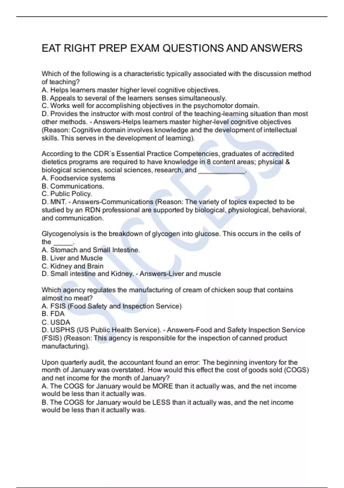 EAT RIGHT PREP EXAM QUESTIONS AND ANSWERS