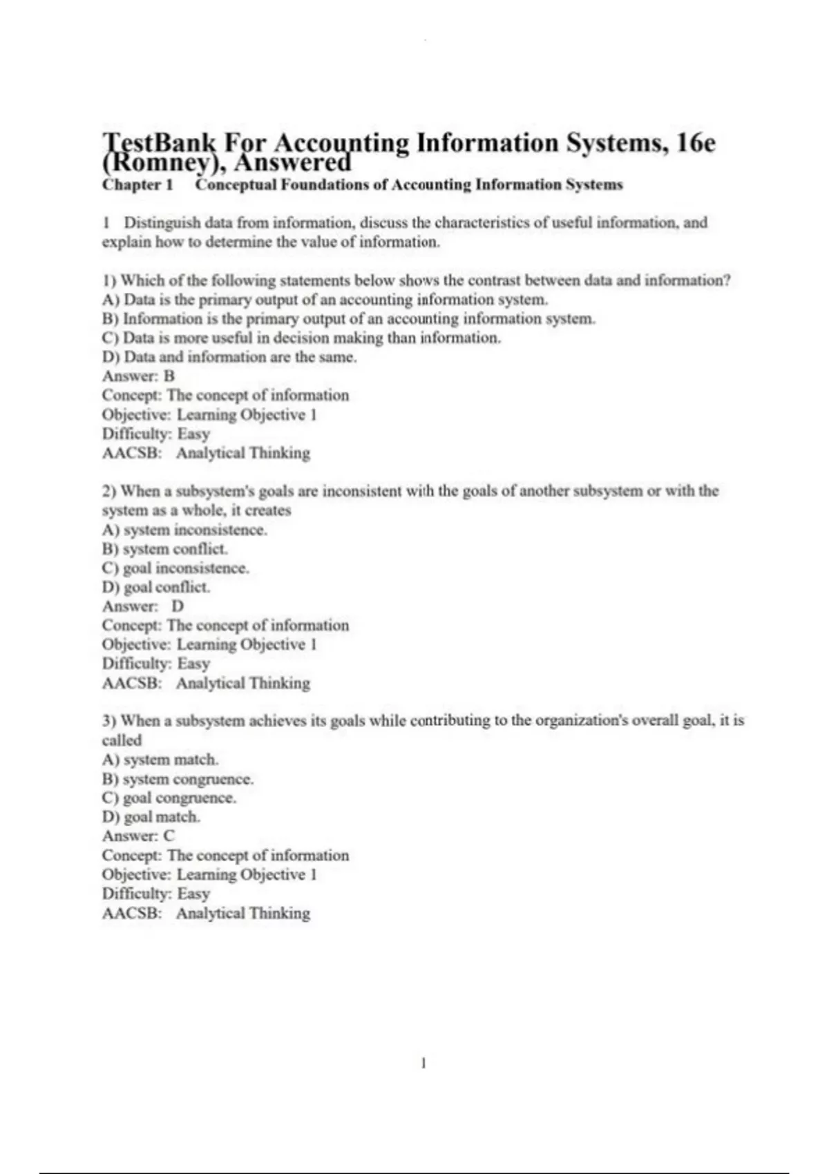 TestBank For Accounting Information Systems, 16e (Romney), Answered-1 Distinguish data from information, discuss the characteristics of useful information, and explain how to determine the value of information. 1) Which of the following statements below shows the contrast between data and information? A) Data is the primary output of an accounting information system. B) Information is the primary output of an accounting information system. C) Data is more useful in decision making than information. D) Data and information are the same. Answer: B Concept: The concept of information Objective: Learning Objective 1 Difficulty: Easy AACSB: Analytical Thinking 2) When a subsystem's goals are inconsistent with the goals of another subsystem or with the system as a whole, it creates A) system inconsistence. B) system conflict. C) goal inconsistence. D) goal conflict. Answer: D Concept: The concept of information Objective: Learning Objective 1 Difficulty: Easy AACSB: Analytical Thinking 3) When a subsystem achieves its goals while contributing to the organization's overall goal, it is called A) system match. B) system congruence. C) goal congruence. D) goal match. Answer: C Concept: The concept of information Objective: Learning Objective 1 Difficulty: Easy AACSB: Analytical Thinking 2 4) Information is best described as A) raw facts about transactions. B) data that has been organized and processed so that it is meaningful to the user. C) facts that are useful when processed in a timely manner. D) the same thing as data. Answer: B Concept: The concept of information Objective: Learning Objective 1 Difficulty: Easy AACSB: Analytical Thinking 5) The value of information can best be determined by A) its usefulness to decision makers. B) its relevance to decision makers. C) the benefits associated with obtaining the information minus the cost of producing it. D) the extent to which it optimizes the value chain. Answer: C Concept: The concept of information Objective: Learning Objective 1 Difficulty: Moderate AACSB: Analytical Thinking 6) An accounting information system (AIS) processes to provide users with . A) data; information B) data; transactions C) information; data D) data; benefits Answer: A Concept: The concept of information Objective: Learning Objective 1 Difficulty: Easy AACSB: Analytical Thinking