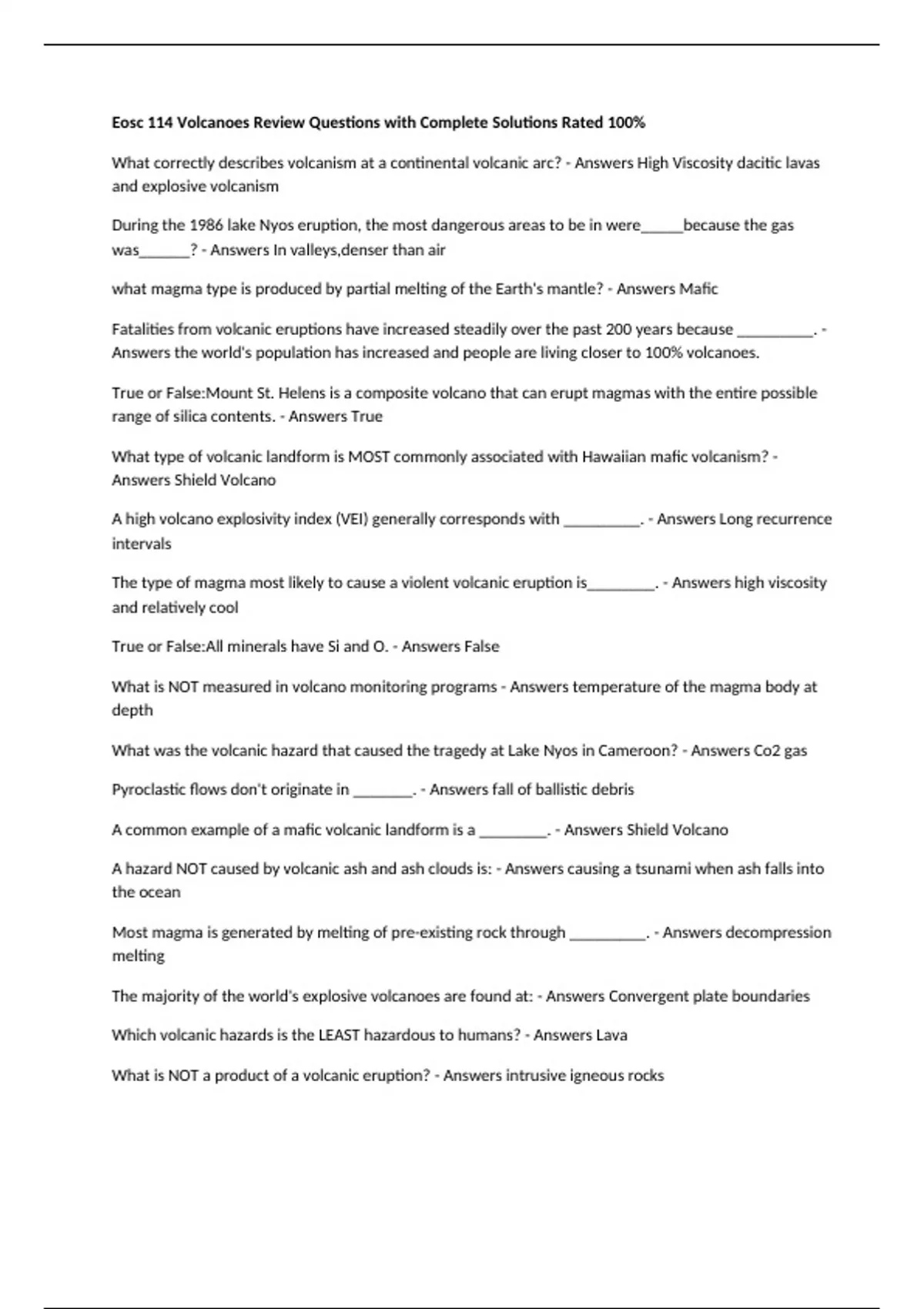 Eosc 114 Volcanoes Review Questions with Complete Solutions Rated 100% What correctly describes volcanism at a continental volcanic arc? - Answers High Viscosity dacitic lavas and explosive volcanism During the 1986 lake Nyos eruption, the most dangerous areas to be in were_____because the gas was______? - Answers In valleys,denser than air what magma type is produced by partial melting of the Earth's mantle? - Answers Mafic Fatalities from volcanic eruptions have increased steadily over the past 200 years because _________. - Answers the world's population has increased and people are living closer to 100% volcanoes. True or False:Mount St. Helens is a composite volcano that can erupt magmas with the entire possible range of silica contents. - Answers True What type of volcanic landform is MOST commonly associated with Hawaiian mafic volcanism? - Answers Shield Volcano A high volcano explosivity index (VEI) generally corresponds with _________. - Answers Long recurrence intervals The type of magma most likely to cause a violent volcanic eruption is________. - Answers high viscosity and relatively cool True or False:All minerals have Si and O. - Answers False What is NOT measured in volcano monitoring programs - Answers temperature of the magma body at depth What was the volcanic hazard that caused the tragedy at Lake Nyos in Cameroon? - Answers Co2 gas Pyroclastic flows don't originate in _______. - Answers fall of ballistic debris A common example of a mafic volcanic landform is a ________. - Answers Shield Volcano A hazard NOT caused by volcanic ash and ash clouds is: - Answers causing a tsunami when ash falls into the ocean Most magma is generated by melting of pre-existing rock through _________. - Answers decompression melting The majority of the world's explosive volcanoes are found at: - Answers Convergent plate boundaries Which volcanic hazards is the LEAST hazardous to humans? - Answers Lava What is NOT a product of a volcanic eruption? - Answers intrusive igneous rocks The MOST LIKELY place to find an active subaerial volcano is ______. - Answers Above a subduction zone A magma erupting at a temperature of 600-800°C, with high silica content, high gas content, and high viscosity will erupt as a/an _________. - Answers rhyolite pyroclastic flow in a caldera he explosivity of hot spot volcanism is dictated by ? - Answers the composition of the overlying plate True or False: about volcanism in an ocean-ocean convergence setting? Mafic-intermediate lavas are common. - Answers True How does a cinder cone form? - Answers Relatively short-lived eruptions of pyroclastic material build up a small volcano. Which volcanic hazard does hydrothermal alteration promote? - Answers Landslides True or False: A Lava flow is is not typical of cinder cone eruptions - Answers False Immediately after an eruption at Kilauea in Hawaii, the surface of the volcano ______. - Answers subsides, making the slopes of the volcano less steep Which of the following volcanic hazards is typically the DEADLIEST for people? - Answers pyroclastic flows from stratovolcanoes Which of the following eruptions had the highest Volcanic Explosivity Index (VEI)? - Answers Yellowstone caldera, 600,000 years ago Which volcano poses the GREATEST risk to life and property in Vancouver and southern British Columbia? - Answers Mount Baker Which magma composition will produce the most explosive volcanoes? - Answers Rhyolite What magma has the highest viscosity ? - Answers Rhyolite Which of the following poses the GREATEST hazard to the Metro Vancouver area from a nearby volcanic eruption? - Answers Ash Fall Large eruptions from stratovolcanoes typically affect climate by ______. - Answers ejecting ash particles that block sunlight and cause global cooling How did the residents of Vestmannaeyjar, Iceland, save their harbor from a lava flow? - Answers They chilled the lava flow with water, making the flow solidify before it blocked the harbor. Which of the following is the most common volcanic rock on Earth? - Answers Basalt