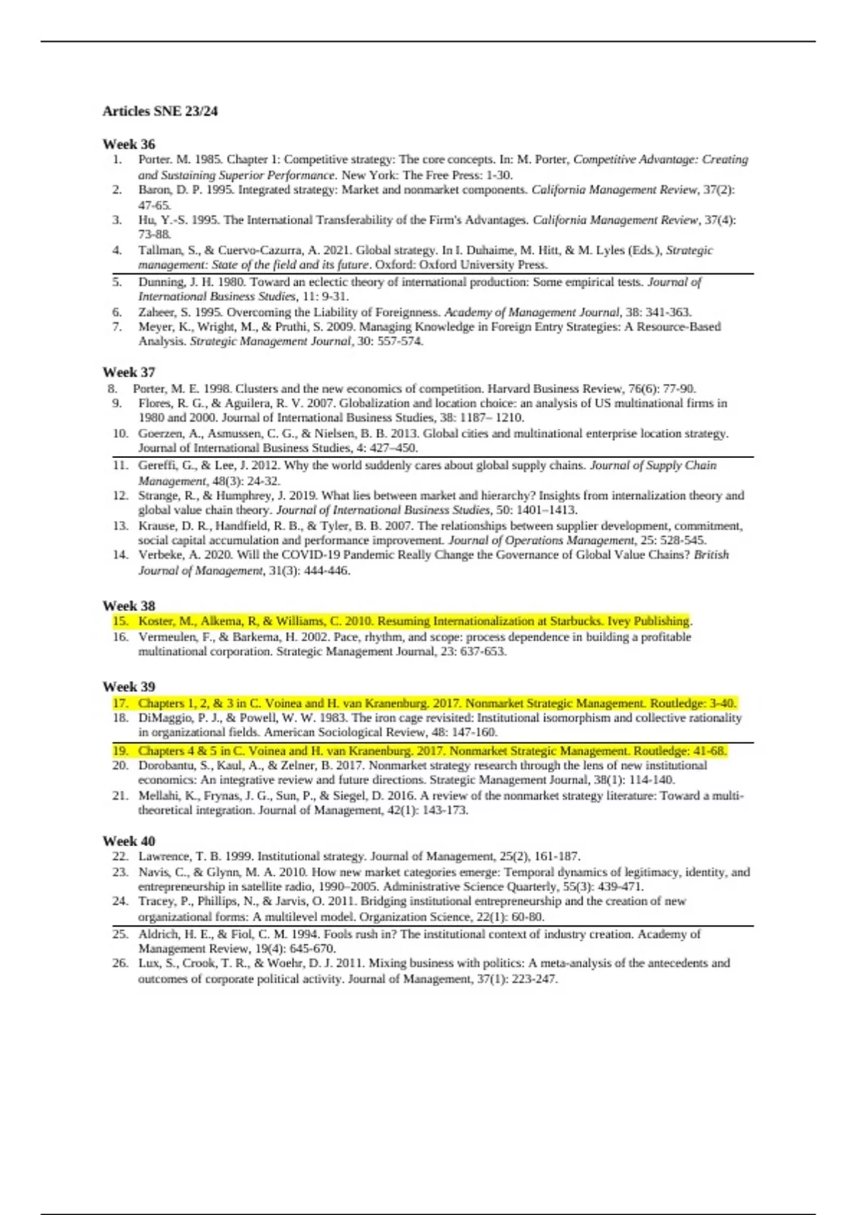 Articles SNE 23/24 1. Porter. M. 1985. Chapter 1: Competitive strategy: The core concepts. In: M. Porter, Competitive Advantage: Creating and Sustaining Superior Performance. New York: The Free Press: 1-30. 2. Baron, D. P. 1995. Integrated strategy: Market and nonmarket components. California Management Review, 37(2): 47-65. 3. Hu, Y.-S. 1995. The International Transferability of the Firm's Advantages. California Management Review, 37(4): 73-88. 4. Tallman, S., & Cuervo-Cazurra, A. 2021. Global strategy. In I. Duhaime, M. Hitt, & M. Lyles (Eds.), Strategic management: State of the field and its future. Oxford: Oxford University Press. 5. Dunning, J. H. 1980. Toward an eclectic theory of international production: Some empirical tests. Journal of International Business Studies, 11: 9-31. 6. Zaheer, S. 1995. Overcoming the Liability of Foreignness. Academy of Management Journal, 38: 341-363. 7. Meyer, K., Wright, M., & Pruthi, S. 2009. Managing Knowledge in Foreign Entry Strategies: A Resource-Based Analysis. Strategic Management Journal, 30: 557-574. 8. Porter, M. E. 1998. Clusters and the new economics of competition. Harvard Business Review, 76(6): 77-90. 9. Flores, R. G., & Aguilera, R. V. 2007. Globalization and location choice: an analysis of US multinational firms in 1980 and 2000. Journal of International Business Studies, 38: 1187– 1210. 10. Goerzen, A., Asmussen, C. G., & Nielsen, B. B. 2013. Global cities and multinational enterprise location strategy. Journal of International Business Studies, 4: 427–450. 11. Gereffi, G., & Lee, J. 2012. Why the world suddenly cares about global supply chains. Journal of Supply Chain Management, 48(3): 24-32. 12. Strange, R., & Humphrey, J. 2019. What lies between market and hierarchy? Insights from internalization theory and global value chain theory. Journal of International Business Studies, 50: 1401–1413. 13. Krause, D. R., Handfield, R. B., & Tyler, B. B. 2007. The relationships between supplier development, commitment, social capital accumulation and performance improvement. Journal of Operations Management, 25: 528-545. 14. Verbeke, A. 2020. Will the COVID-19 Pandemic Really Change the Governance of Global Value Chains? British Journal of Management, 31(3): 444-446. 15. Vermeulen, F., & Barkema, H. 2002. Pace, rhythm, and scope: process dependence in building a profitable multinational corporation. Strategic Management Journal, 23: 637-653. 16. DiMaggio, P. J., & Powell, W. W. 1983. The iron cage revisited: Institutional isomorphism and collective rationality in organizational fields. American Sociological Review, 48: 147-160. 17. Dorobantu, S., Kaul, A., & Zelner, B. 2017. Nonmarket strategy research through the lens of new institutional economics: An integrative review and future directions. Strategic Management Journal, 38(1): 114-140. 18. Mellahi, K., Frynas, J. G., Sun, P., & Siegel, D. 2016. A review of the nonmarket strategy literature: Toward a multi-theoretical integration. Journal of Management, 42(1): 143-173. 19. Lawrence, T. B. 1999. Institutional strategy. Journal of Management, 25(2), 161-187. 20. Navis, C., & Glynn, M. A. 2010. How new market categories emerge: Temporal dynamics of legitimacy, identity, and entrepreneurship in satellite radio, 1990–2005. Administrative Science Quarterly, 55(3): 439-471. 21. Tracey, P., Phillips, N., & Jarvis, O. 2011. Bridging institutional entrepreneurship and the creation of new organizational forms: A multilevel model. Organization Science, 22(1): 60-80. 22. Aldrich, H. E., & Fiol, C. M. 1994. Fools rush in? The institutional context of industry creation. Academy of Management Review, 19(4): 645-670. Lux, S., Crook, T. R., & Woehr, D. J. 2011. Mixing business with politics: A meta-analysis of the antecedents and outcomes of corporate political activity. Journal of Management, 37(1): 223-247.