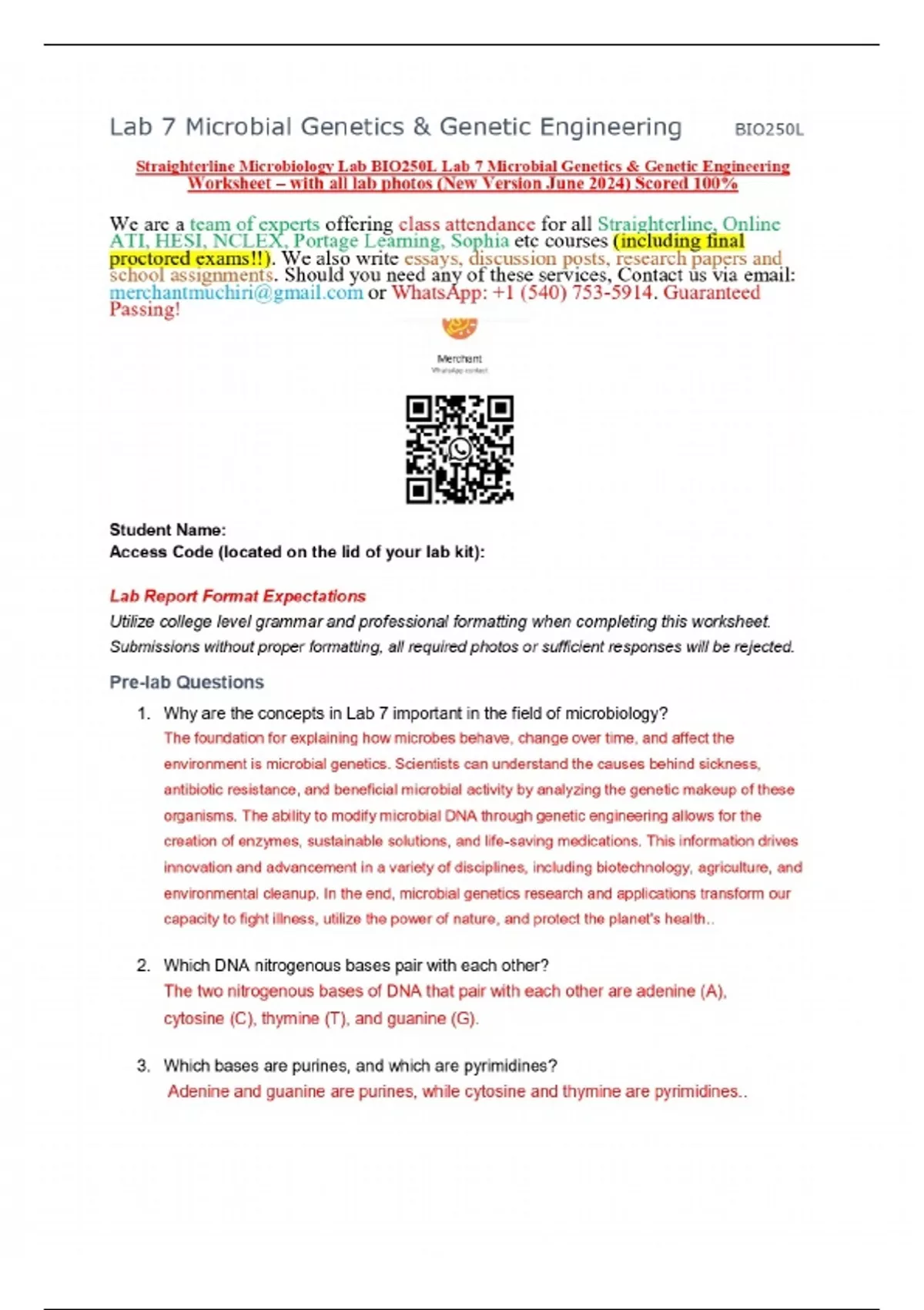 Straighterline Microbiology Lab BIO250L Lab 7 Microbial Genetics & Genetic Engineering Worksheet – with all lab photos (New Version June 2024) Scored 100%