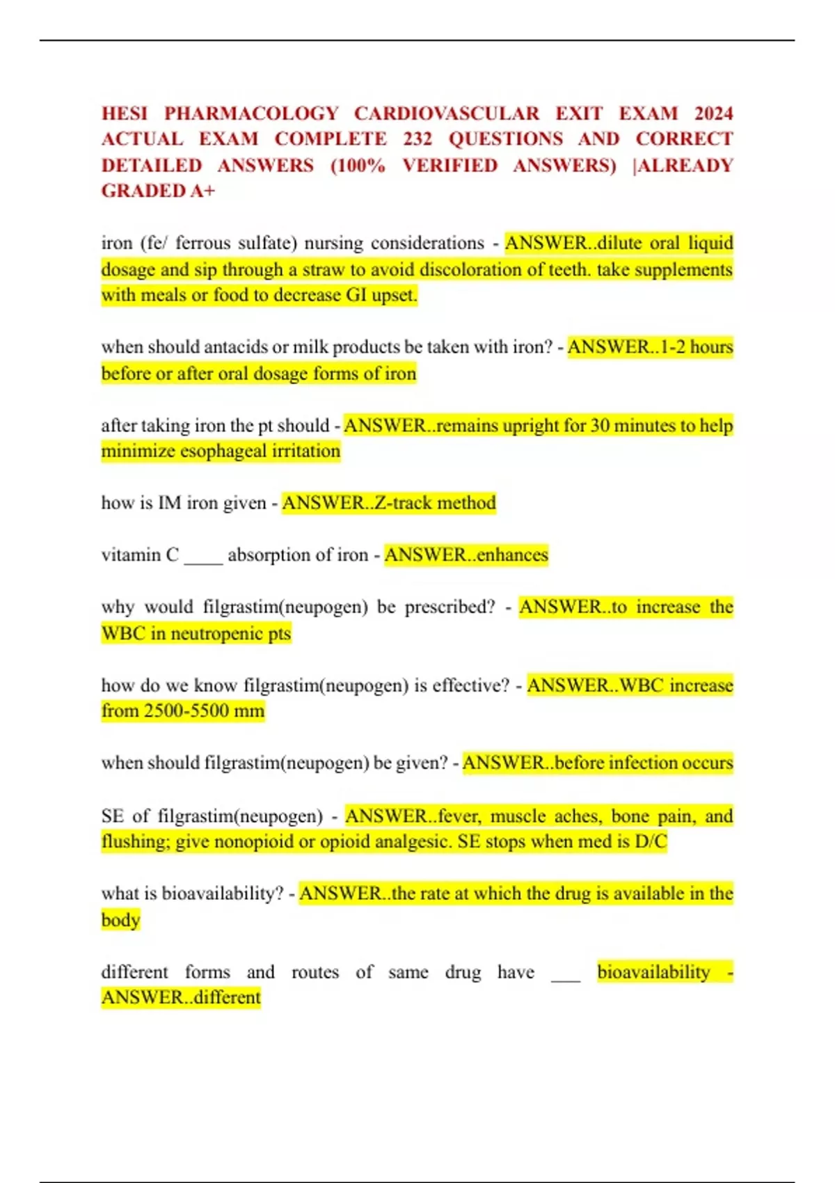 HESI PHARMACOLOGY CARDIOVASCULAR EXIT EXAM 2024 ACTUAL EXAM COMPLETE 232 QUESTIONS AND CORRECT DETAILED ANSWERS (100% VERIFIED ANSWERS) |ALREADY GRADED A+