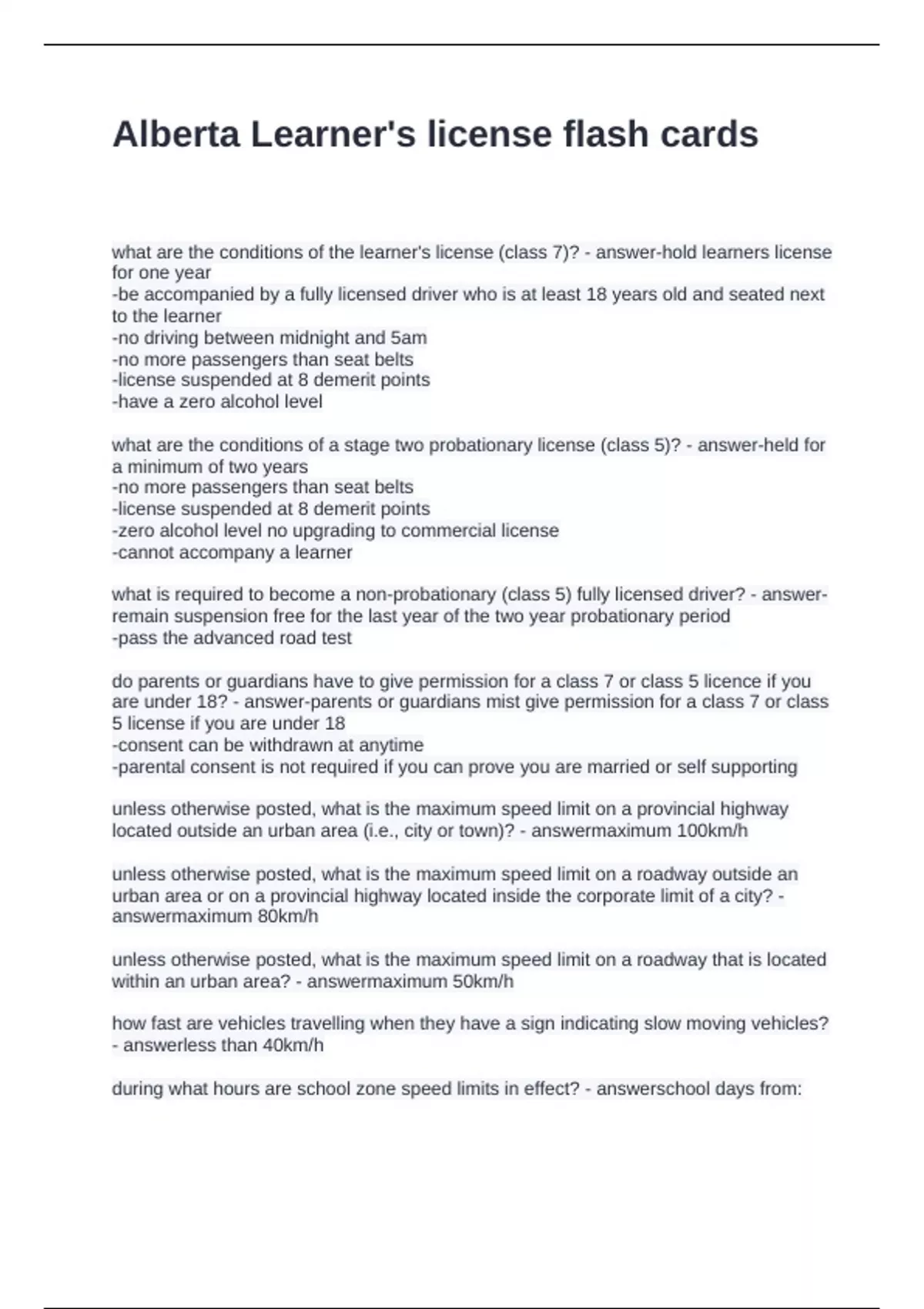 Alberta Learner's license flash cards