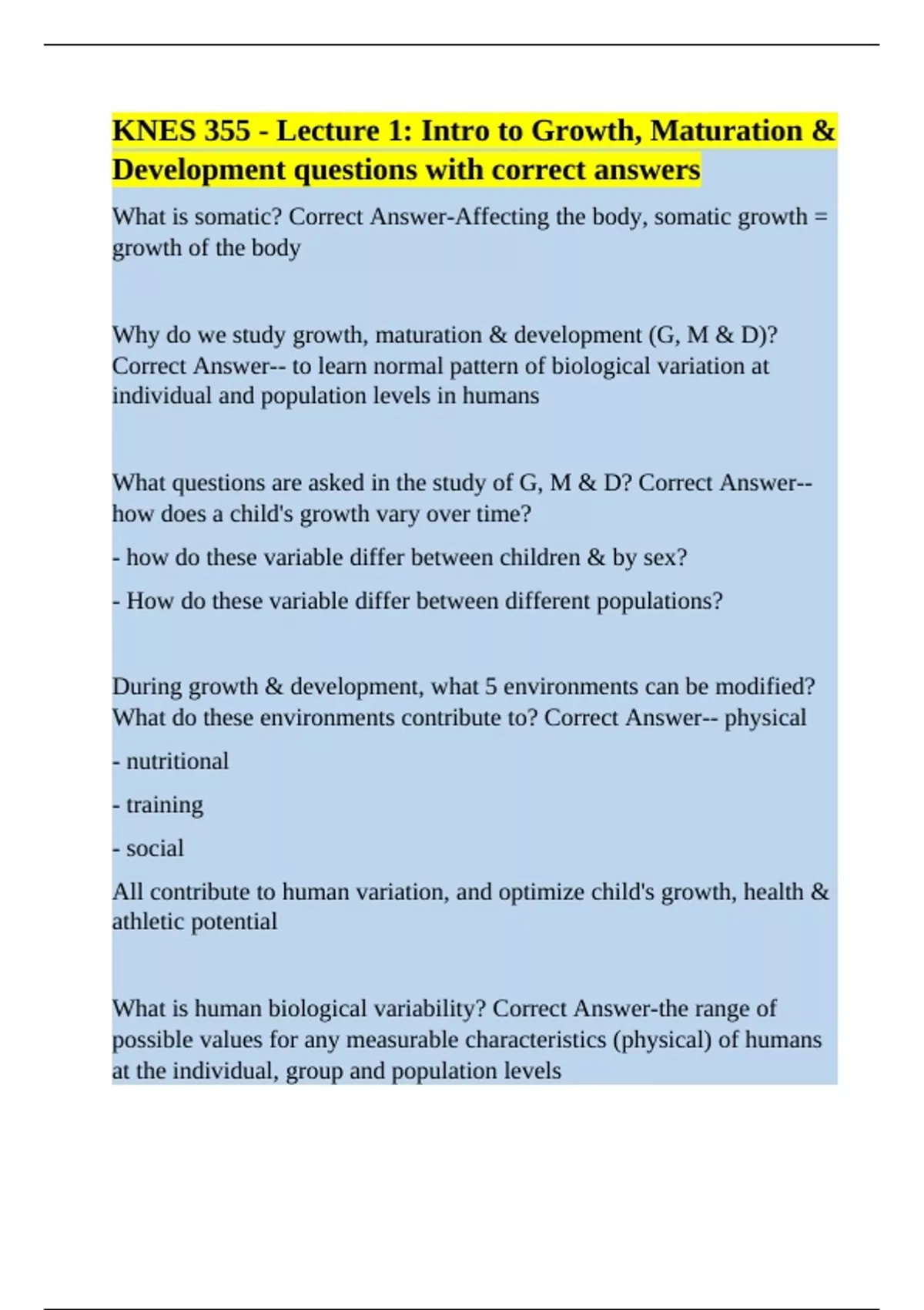 KNES 355 - Lecture 1: Intro to Growth, Maturation & Development questions with correct answers