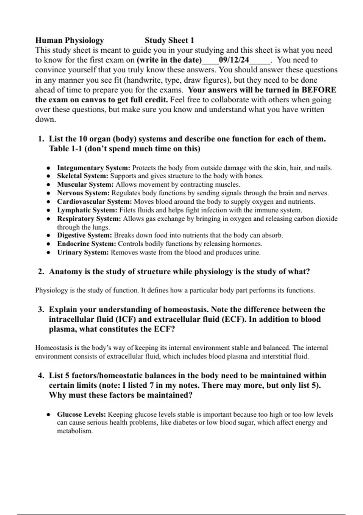 1. List the 10 organ (body) systems and describe one function for each of them.