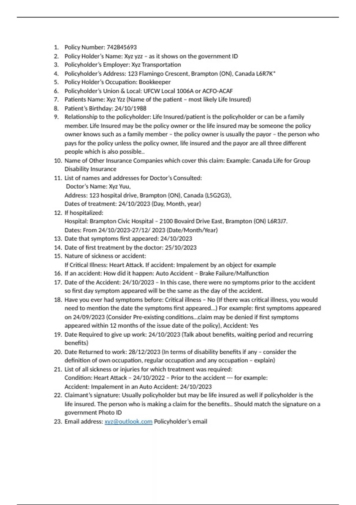 4. Policyholder’s Address: 123 Flamingo Crescent, Brampton (ON), Canada L6R7K*