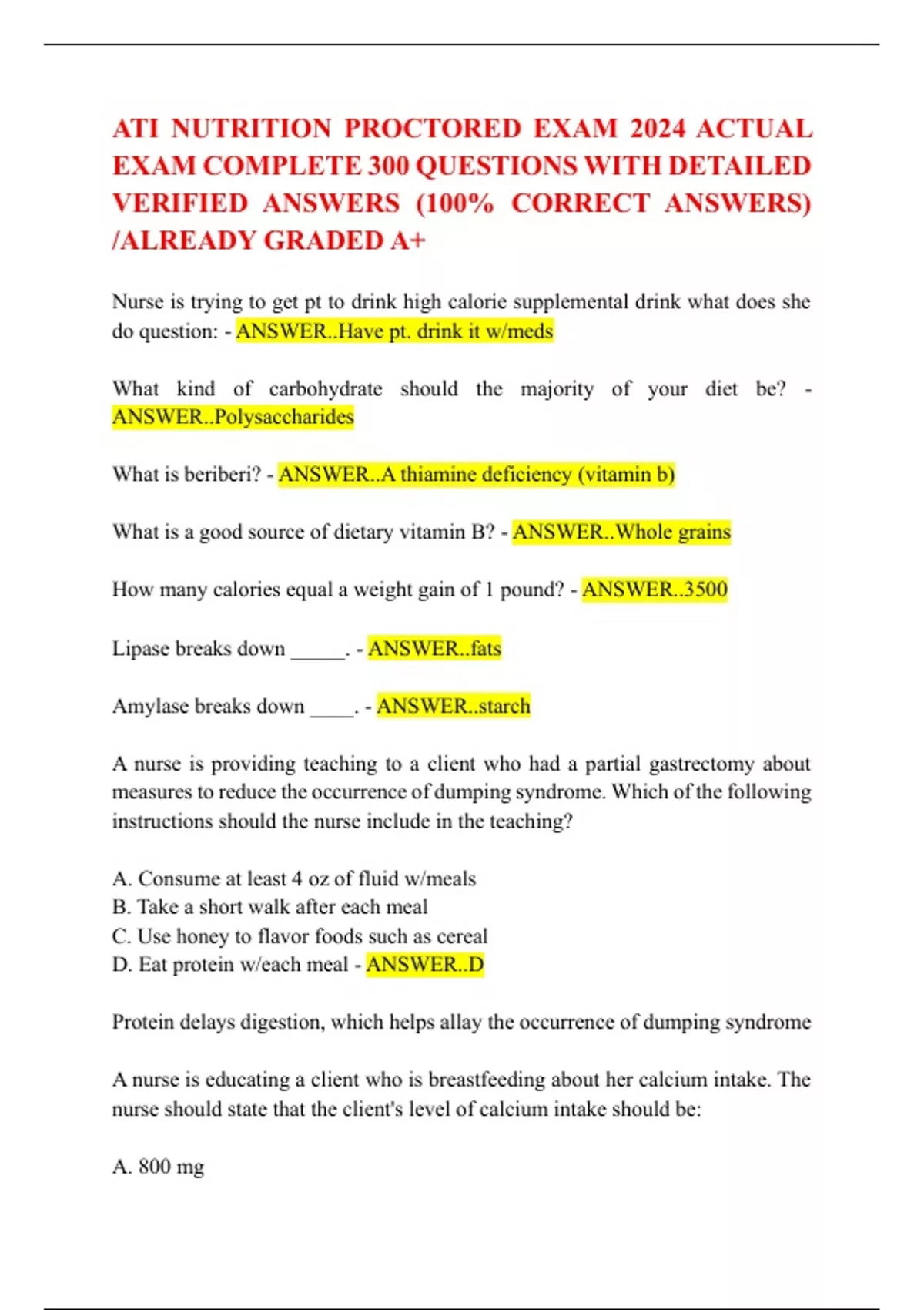 ATI NUTRITION PROCTORED EXAM 2024 ACTUAL EXAM COMPLETE 300 QUESTIONS WITH DETAILED VERIFIED ANSWERS (100% CORRECT ANSWERS) /ALREADY GRADED A+