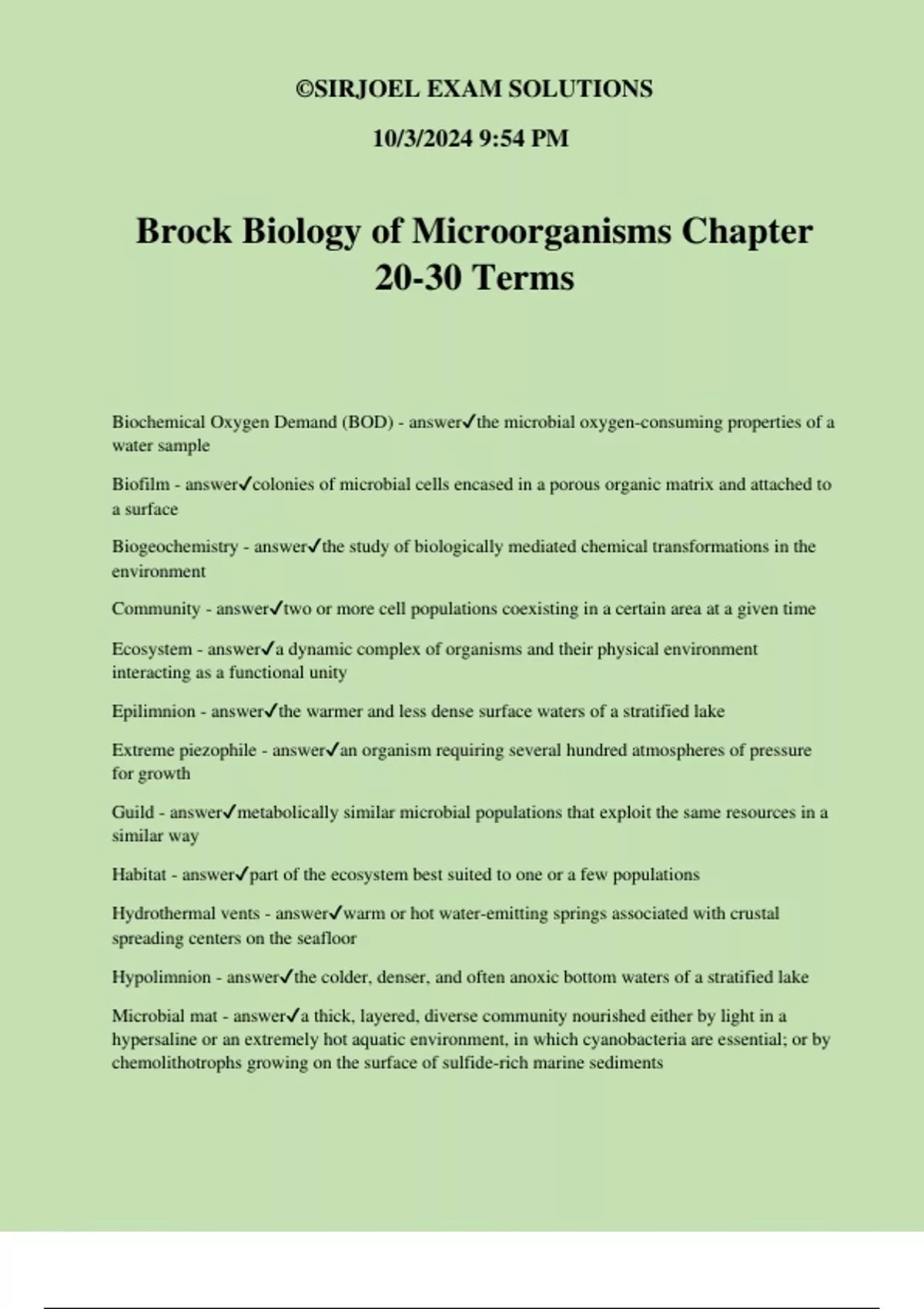 Brock Biology of Microorganisms Chapter 20-30 Terms Biochemical Oxygen Demand (BOD) - answerthe microbial oxygen-consuming properties of a water sample Biofilm - answercolonies of microbial cells encased in a porous organic matrix and attached to a surface Biogeochemistry - answerthe study of biologically mediated chemical transformations in the environment Community - answertwo or more cell populations coexisting in a certain area at a given time Ecosystem - answera dynamic complex of organisms and their physical environment interacting as a functional unity Epilimnion - answerthe warmer and less dense surface waters of a stratified lake Extreme piezophile - answeran organism requiring several hundred atmospheres of pressure for growth Guild - answermetabolically similar microbial populations that exploit the same resources in a similar way Habitat - answerpart of the ecosystem best suited to one or a few populations Hydrothermal vents - answerwarm or hot water-emitting springs associated with crustal spreading centers on the seafloor Hypolimnion - answerthe colder, denser, and often anoxic bottom waters of a stratified lake Microbial mat - answera thick, layered, diverse community nourished either by light in a hypersaline or an extremely hot aquatic environment, in which cyanobacteria are essential; or by chemolithotrophs growing on the surface of sulfide-rich marine sediments