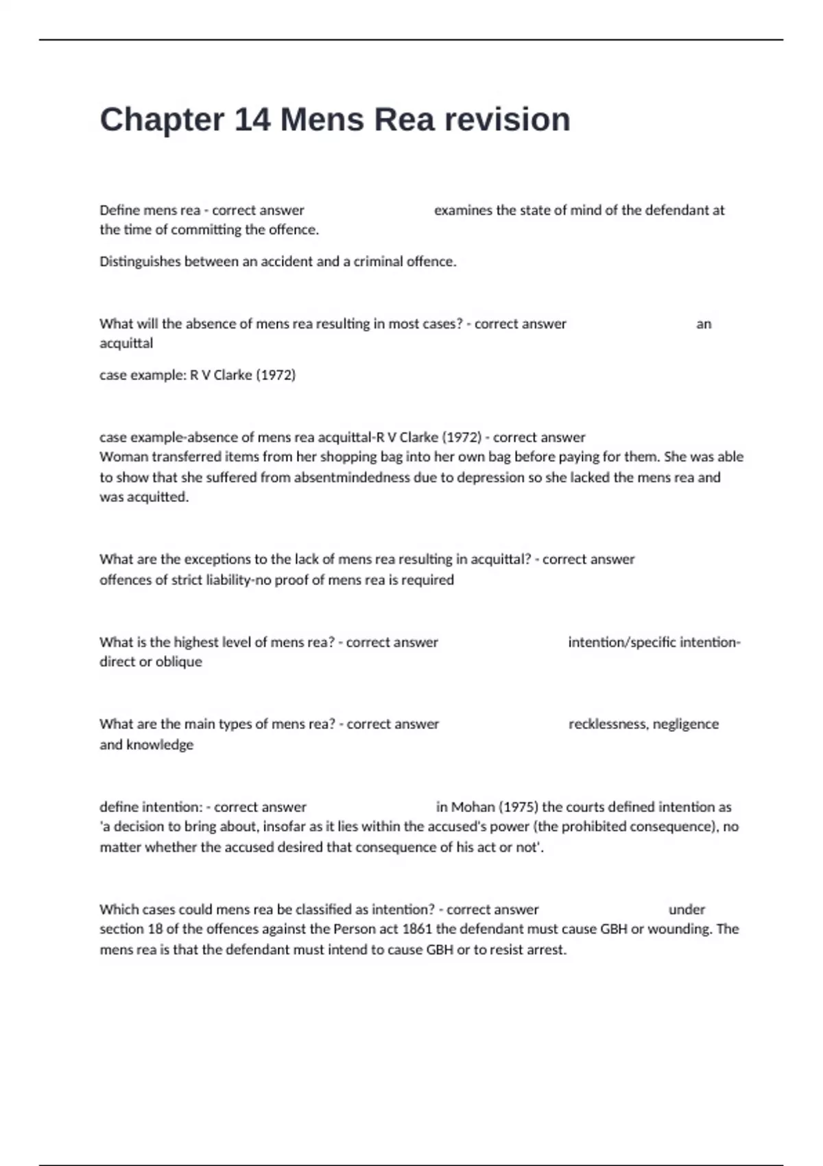 Chapter 14 Mens Rea revision Study Guide With Practical Exam Actual Answers.