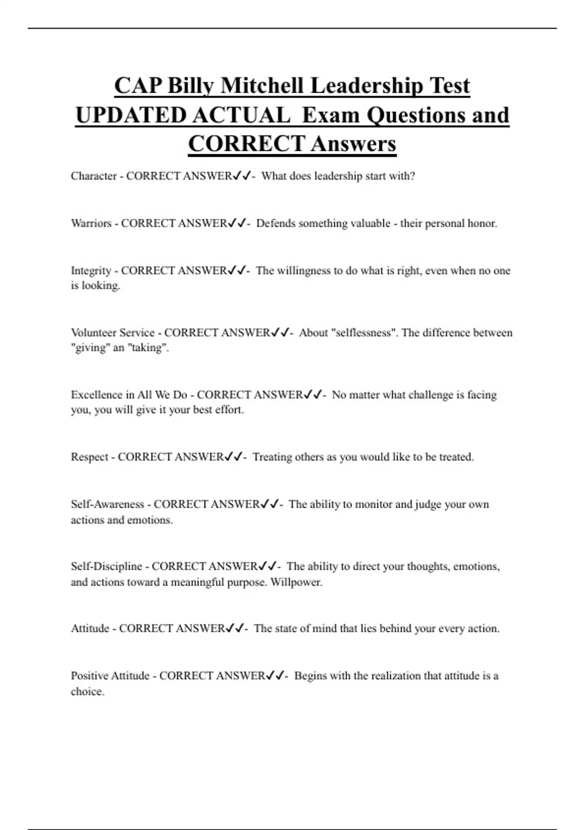 CAP Billy Mitchell Leadership Test UPDATED ACTUAL Exam Questions and CORRECT Answers Character - CORRECT ANSWER- What does leadership start with? Warriors - CORRECT ANSWER- Defends something valuable - their personal honor. Integrity - CORRECT ANSWER- The willingness to do what is right, even when no one is looking