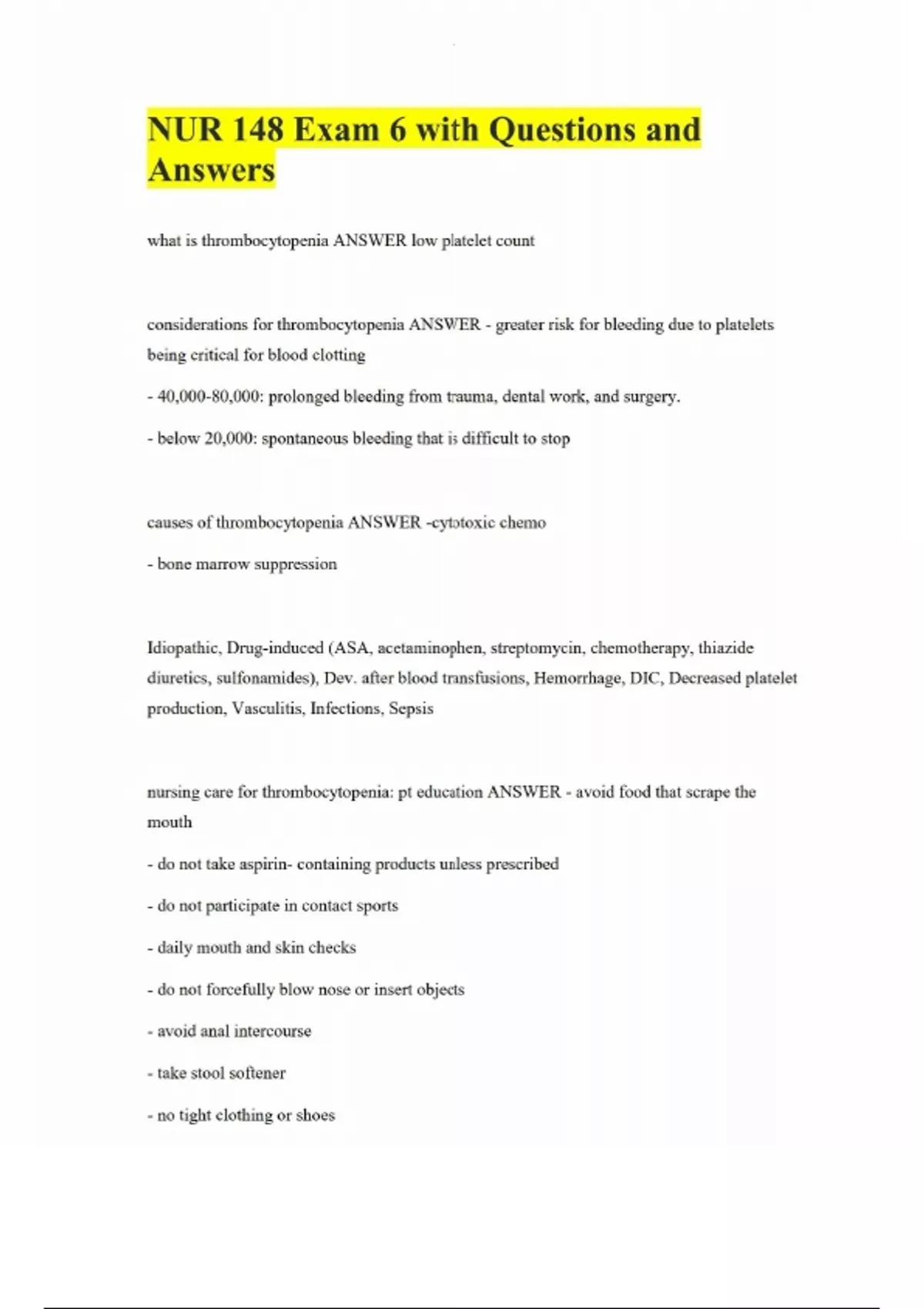 NUR 148 Exam 6 with Questions and Answers what is thrombocytopenia ANSWER low platelet count considerations for thrombocytopenia ANSWER - greater risk for bleeding due to platelets being critical for blood clotting - 40,000-80,000: prolonged bleeding from trauma, dental work, and surgery. - below 20,000: spontaneous bleeding that is difficult to stop causes of thrombocytopenia ANSWER -cytotoxic chemo - bone marrow suppression Idiopathic, Drug-induced (ASA, acetaminophen, streptomycin, chemotherapy, thiazide diuretics, sulfonamides), Dev. after blood transfusions, Hemorrhage, DIC, Decreased platelet production, Vasculitis, Infections, Sepsis nursing care for thrombocytopenia: pt education ANSWER - avoid food that scrape the mouth - do not take aspirin- containing products unless prescribed - do not participate in contact sports - daily mouth and skin checks - do not forcefully blow nose or insert objects - avoid anal intercourse - take stool softener - no tight clothing or shoes