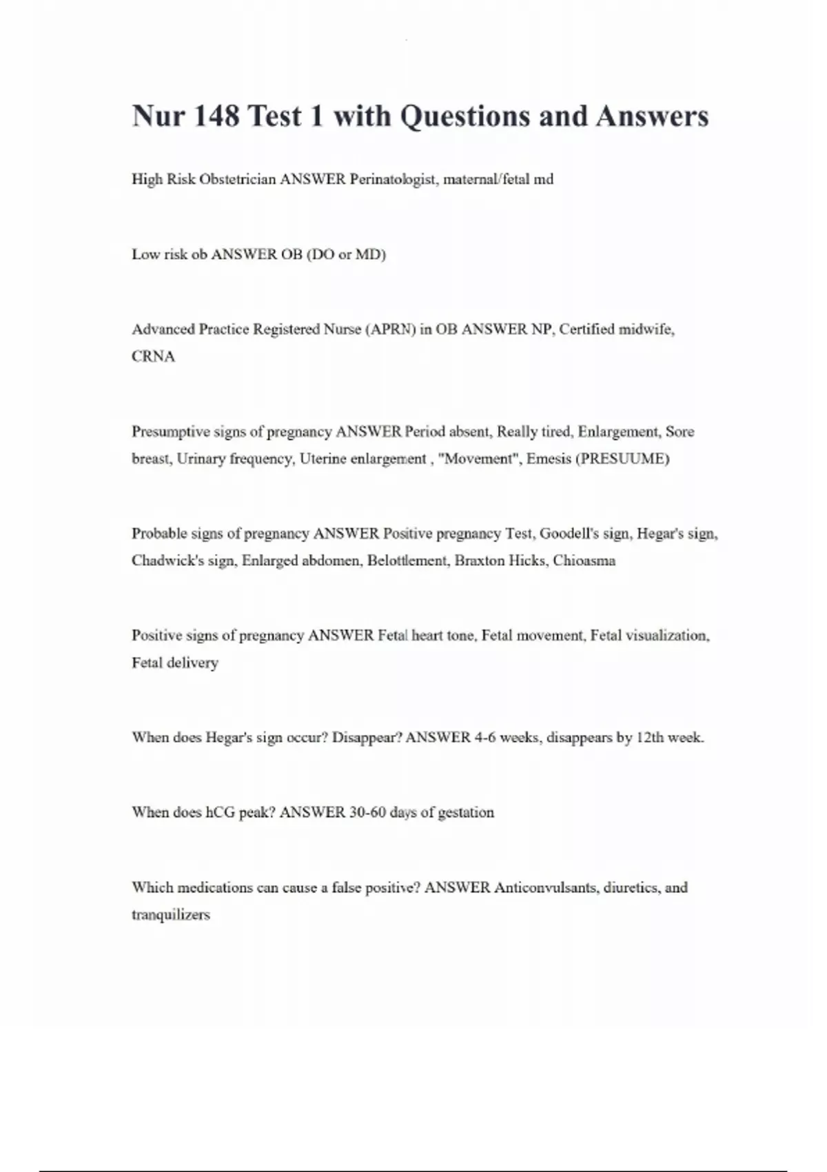Nur 148 Test 1 with Questions and Answers High Risk Obstetrician ANSWER Perinatologist, maternal/fetal md Low risk ob ANSWER OB (DO or MD) Advanced Practice Registered Nurse (APRN) in OB ANSWER NP, Certified midwife, CRNA Presumptive signs of pregnancy ANSWER Period absent, Really tired, Enlargement, Sore breast, Urinary frequency, Uterine enlargement , "Movement", Emesis (PRESUUME) Probable signs of pregnancy ANSWER Positive pregnancy Test, Goodell's sign, Hegar's sign, Chadwick's sign, Enlarged abdomen, Belottlement, Braxton Hicks, Chioasma Positive signs of pregnancy ANSWER Fetal heart tone, Fetal movement, Fetal visualization, Fetal delivery When does Hegar's sign occur? Disappear? ANSWER 4-6 weeks, disappears by 12th week. When does hCG peak? ANSWER 30-60 days of gestation Which medications can cause a false positive? ANSWER Anticonvulsants, diuretics, and tranquilizers What 3 areas does the health team focus on during the prenatal period? ANSWER Easing